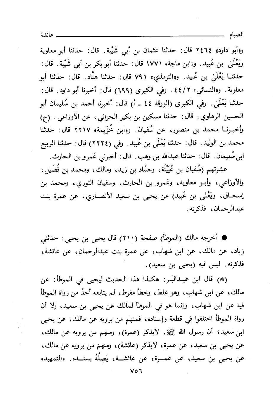 فُضَيل، والاوزاعي، وابو معاوية، وعَمرو بن الحارث، وسفيان الثوري، ومحمد بن اسحاق، وَيعْلى بن عُبيد) عن يحيى بن سعيد الانصاري، عن عمرة بنت عبد الرحما ن، فذكرته.