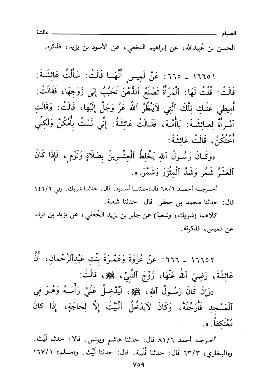 ١٦٦٥٢ - عَنْ عُرْوَةَ وَعَمْرَةَ بِنْتِ عبد الرحمن، انَّ عَائِشَةَ، رَضِيَ الله عنها، زَوْجَ النَّبِىِّ صلى الله عليه وسلم، قَالَتْ: