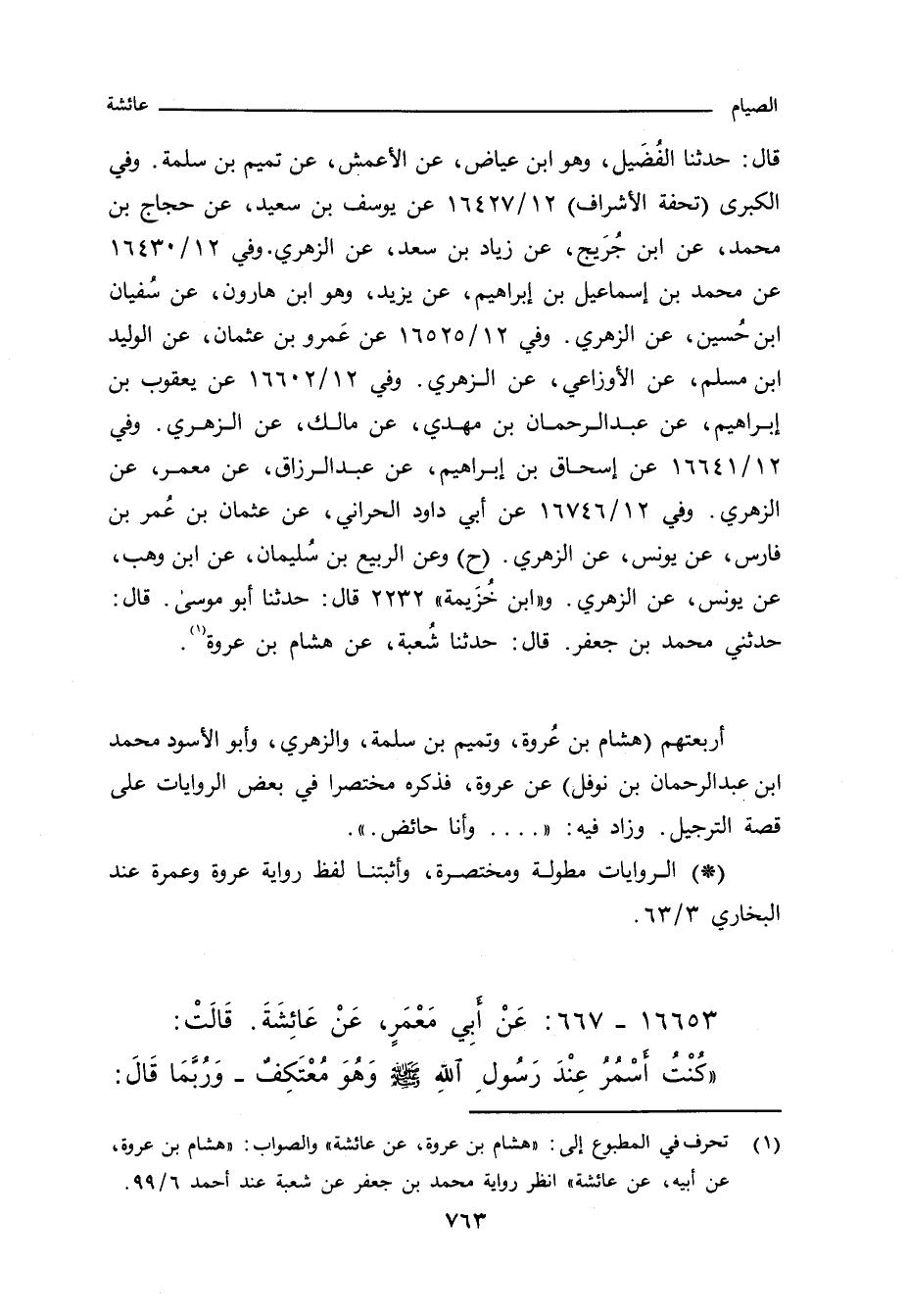 اربعتهم (هشام بن عُروة، وتميم بن سلمة، والزهري، وابو الاسود محمد بن عبد الرحمن بن نوفل) عن عروة، فذكره مختصرا في بعض الروايات على قصة الترجيل. وزاد فيه:. . . . وانا حائض.