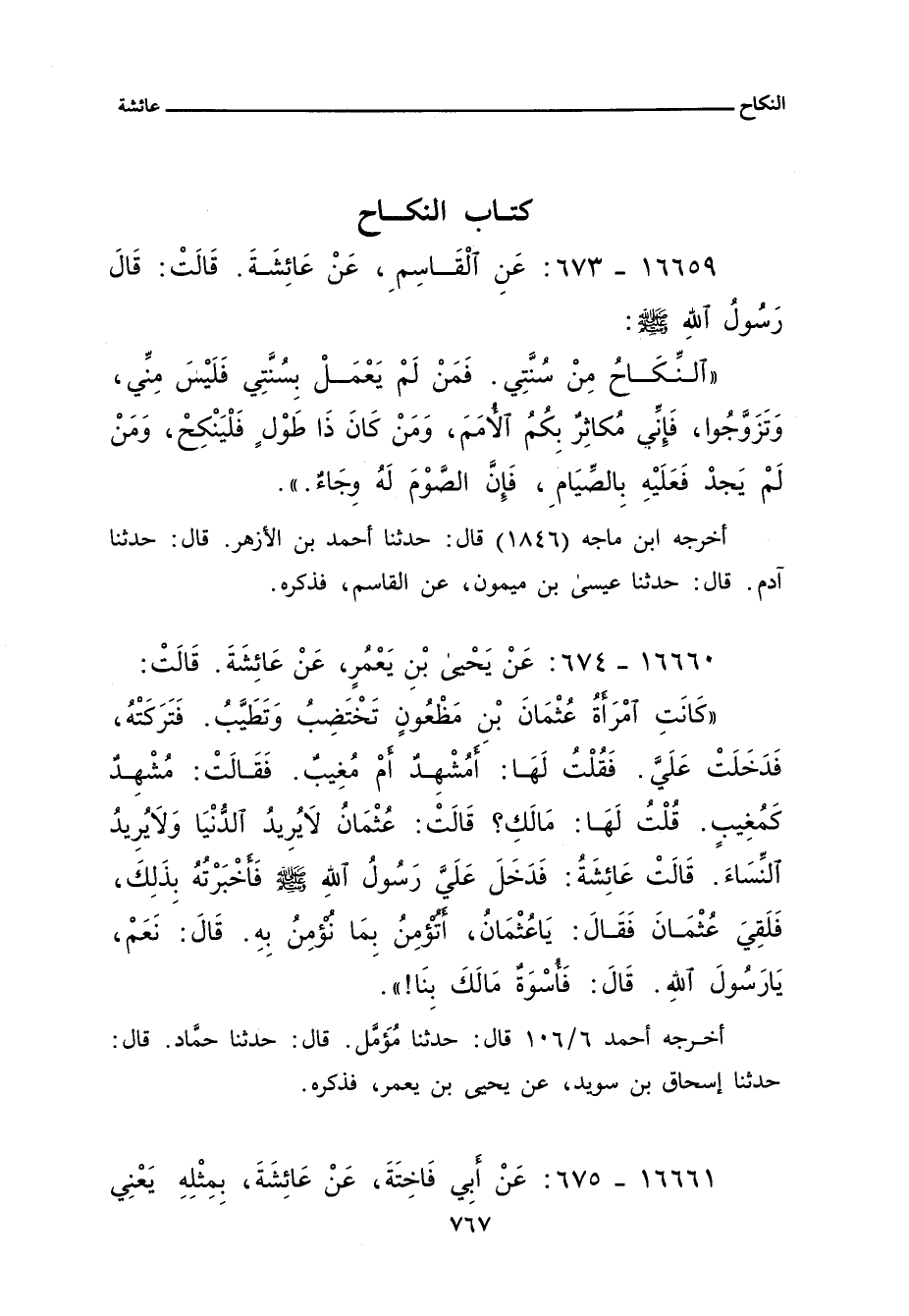 ١٦٦٥٩ - عَنِ الْقَاسِمِ، عَنْ عَائِشَةَ. قَالَتْ: قَالَ رَسُولُ اللَّهِ صلى الله عليه وسلم: