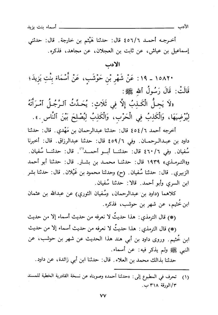 ١٥٨٢٠ - عَنْ شَهْرِ بْنِ حَوْشَبِ، عَنْ أسْمَاءَ بنْتِ يَزِيدَ؛ قالت: قَالَ رَسُولُ الله صلى الله عليه وسلم: