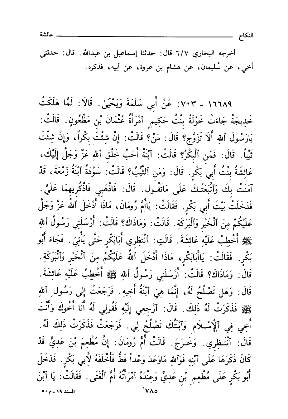 ١٦٦٨٩ - عَنْ ابِي سَلَمَةَ وَيَحْيَى. قالا: لَمَّا هَلَكَتْ خَدِيجَةُ جَاءَتْ خَوْلَةُ بِنْتُ حَكِيمٍ امْرَاةُ عُثْمَانَ بْنِ مَظْعُونٍ. قَالَتْ: يَا رَسُولَ اللَّهِ الا تَزَوَّجُ؟ قال: مَنْ؟ قَالَتْ: انْ شِئْتَ بِكْرا، وَانْ شِئْتَ ثَيِّبا. قال: فَمَنِ الْبِكْرُ؟. قَالَتْ: ابْنَةُ احَبِّ خَلْقِ اللَّهِ عَزَّ وَجَلَّ الَيْكَ، عَائِشَةُ بِنْتُ ابِى بَكْرٍ. قال: وَمَنِ الثَّيِّبُ؟ قَالَتْ: سَوْدَةُ ابْنَةُ زَمْعَةَ، قَدْ امَنَتْ بِكَ وَاتَّبَعَتْكَ عَلَى مَا تَقُولُ. قال: فَاذْهَبِى فَاذْكُرِيهِمَا عَلَىَّ. فَدَخَلَتْ بَيْتَ ابِى بَكْرٍ. فَقَالَتْ: يَا امَّ رُومَانَ، مَاذَا ادْخَلَ اللَّهُ عَزَّ وَجَلَّ عَلَيْكُمْ مِنَ الْخَيْرِ وَالْبَرَكَةِ. قَالَتْ: وَمَا ذَاكَ؟ قَالَتْ: ارْسَلَنِى رَسُولُ اللَّهِ صلى الله عليه وسلم اخْطُبُ عَلَيْهِ عَائِشَةَ. قَالَتْ: انْتَظِرِى ابَا بَكْرٍ حَتَّى يَاتِىَ. فَجَاءَ أبو بَكْرٍ. فَقَالَتْ: يَا ابَا بَكْرٍ، مَاذَا ادْخَلَ اللَّهُ عَلَيْكُمْ مِنَ الْخَيْرِ وَالْبَرَكَةِ. قال: وَمَا ذَاكَ؟ قَالَتْ: ارْسَلَنِى رَسُولُ اللَّهِ صلى الله عليه وسلم اخْطُبُ عَلَيْهِ عَائِشَةَ. قال: وَهَلْ تَصْلُحُ لَهُ، انَّمَا هِىَ ابْنَةُ اخِيهِ. فَرَجَعْتُ الَى رَسُولِ اللَّهِ صلى الله عليه وسلم فَذَكَرْتُ لَهُ ذَلِكَ. قال: ارْجِعِى الَيْهِ فَقُولِى لَهُ انَا اخُوكَ وَانْتَ اخِى فِى الاسْلامِ وَابْنَتُكَ تَصْلُحُ لِى. فَرَجَعْتُ فَذَكَرْتُ ذَلِكَ لَهُ. قال: انْتَظِرِى. وَخَرَجَ. قَالَتْ امُّ رُومَانَ: انَّ مُطْعِمَ بْنَ عَدِىٍّ قَدْ كَانَ ذَكَرَهَا عَلَى ابْنِهِ فَوَاللَّهِ مَا وَعَدَ وَعْدا قَطُّ فَاخْلَفَهُ لابِى بَكْرٍ. فَدَخَلَ أبو بَكْرٍ عَلَى مُطْعِمِ بْنِ عَدِىٍّ وَعِنْدَهُ امْرَاتُهُ امُّ الْفَتَى. فَقَالَتْ: يَا