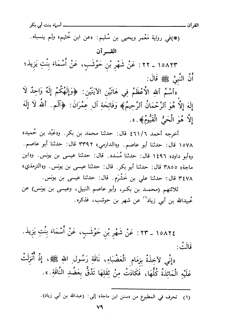 ١٥٦٢٤ - ٢٣: عَنْ شَهْرِبْنِ حَوْشَبٍ، عَنْ أسْمَاءَ بِنْتِ يَزِيدَ. قالت: