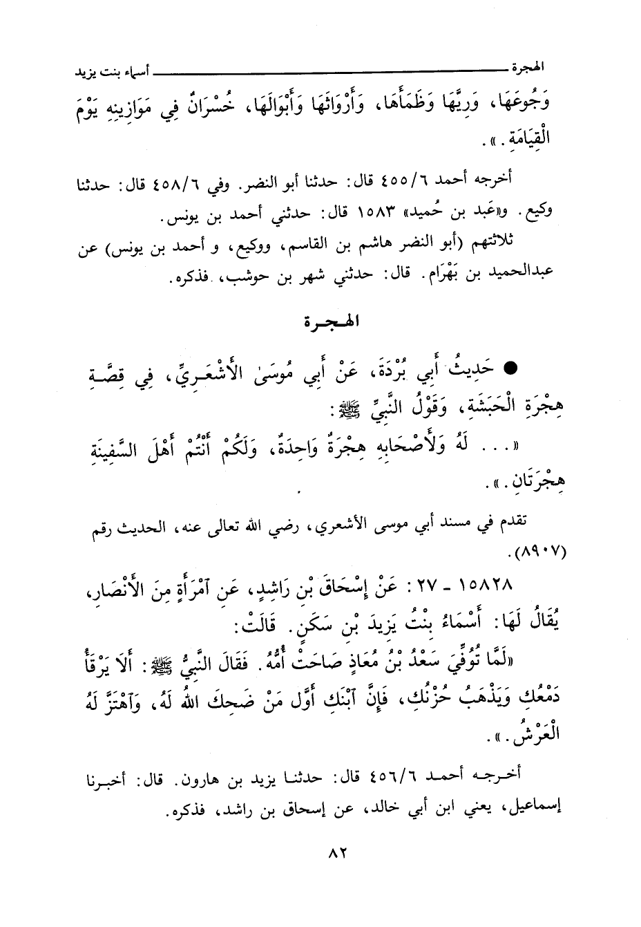 ١٥٨٢٨ - عَنْ إِسْحَاقَ بْن رَاشِدٍ، عَنِ آمْرَأةٍ مِنَ الأنْصَارِ، يُقَالُ لَهَا: أسْمَاءُ بِنْتُ يَزِيدَ بْنِ سَكَنِ. قالت: