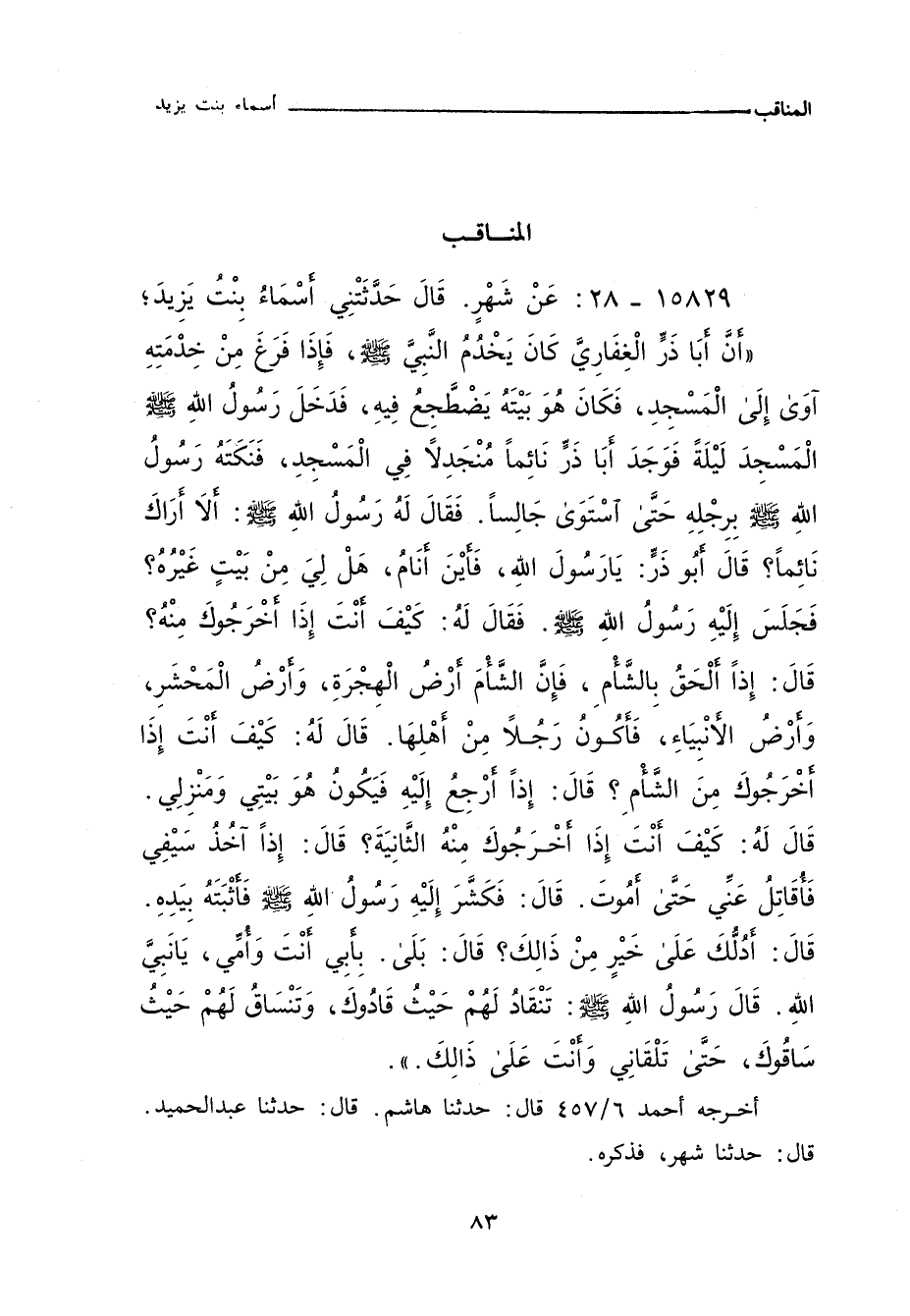 أَنَّ أَبَا ذَرٍّ الْغِفَارِيَّ كَانَ يَخْدُمُ النَّبِىَّ صلى الله عليه وسلم، فَإِذَا فَرَغَ مِنْ خِدْمَتِهِ آوَى إِلَى الْمَسْجِدِ، فَكَانَ هُوَ بَيْتُهُ يَضْطَجِعُ فِيهِ، فَدَخَلَ رَسُولُ الله صلى الله عليه وسلم الْمَسْجِدَ لَيْلَةً فَوَجَدَ أَبَا ذَرٍّ نَائِمًا مُنْجَدِلاً في الْمَسْجِدِ، فَنَكَتَهُ رَسُولُ الله صلى الله عليه وسلم بِرِجْلِهِ حَتَّى اسْتَوَى جَالِسًا. فَقَالَ لَهُ رَسُولُ الله صلى الله عليه وسلم وسلم: أَلَا أَرَاكَ نَائِمًا؟ قَالَ أَبُو ذَرٍّ: يَا رَسُولَ الله، فَأَيْنَ أَنَامُ، هَلْ لِى مِنْ بَيْتٍ غَيْرُهُ؟ فَجَلَسَ إِلَيْهِ رَسُولُ الله صلى الله عليه وسلم فَقَالَ لَهُ: كَيْفَ أَنْتَ إِذَا أَخْرَجُوكَ مِنْهُ؟ قال: إِذًا أَلْحَقَ بِالشَّامِ، فَإِنَّ الشَّامَ أَرْضُ الْهِجْرَةِ، وَأَرْضُ الْمَحْشَرِ، وَأَرْضُ الأَنْبِيَاءِ، فَأَكُونُ رَجُلاً مِنْ أَهْلِهَا. قَالَ لَهُ: كَيْفَ أَنْتَ إِذَا أَخْرَجُوكَ مِنَ الشَّامِ؟ قال: إِذًا أَرْجِعَ إِلَيْهِ فَيَكُونَ هُوَ بَيْتِى وَمَنْزِلِى. قَالَ لَهُ: كَيْفَ أَنْتَ إِذَا أَخْرَجُوكَ مِنْهُ الثَّانِيَةَ , قال: إِذًا آخُذَ سَيْفي فَأُقَاتِلَ عَنِّى حَتَّى أَمُوتَ , قال: فَكَشَّرَ إِلَيْهِ رَسُولُ الله صلى الله عليه وسلم فَأَثْبَتَهُ بِيَدِهِ قال: أَلَا أَدُلُّكَ عَلَى خَيْرٍ مِنْ ذاَلِكَ؟ قال: بَلَى. بِأبيِ أَنْتَ وَأُمِّي، يَا نَبِيَّ الله. قَالَ رَسُولُ الله صلى الله عليه وسلم: تَنْقَادُ لَهُمْ حَيْثُ قَادُوكَ، وَتَنْسَاقُ لَهُمْ حَيْثُ سَاقُوكَ، حَتَّى تَلْقَانِي وَأَنْتَ عَلَى ذاَلِكَ.