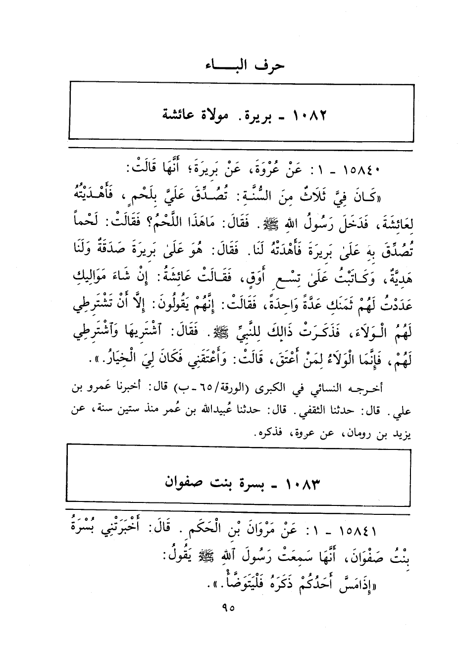 كَانَ فِيَّ ثَلَاثٌ مِنَ السُّنَّةِ: تُصُدِّقَ عَلَيَّ بِلَحْمٍ، فَأهْدَيْتُهُ لِعَائِشَةَ، فَدَخَلَ رَسُولُ اللَّهِ صلى الله عليه وسلم. فَقال: ماَ هَذَا اللَّحْمُ؟ فَقالت: لَحْمًا تُصُذَقَ بِهِ عَلَى بَرِيرَةَ فَأهْدَتْهُ لَنَا. فَقال: هُوَ عَلَى بَرِيرَةَ صَدَقَةٌ وَلَنَا هَدِيَّة، وَكَاتَبْتُ على تِسْعِ أوَقٍ، فَقَالَتْ عَائِشَةُ: إِنْ شَاءَ مَوَالِيكِ عَدَدْتُ لَهُمْ ثَمَنَكِ عَدَّةً وَاحِدَةً، فَقالت: إِنَّهُمْ يَقُولُونَ: إِلَا أَنْ تَشْتَرِطِي لَهمُ الْوَلَاءَ، فَذَكَرَتْ ذَالكَ لِلنَّبِيِّ صلى الله عليه وسلم. فَقال: اشْتَرِيهَا وَآشْتَرِطِي لَهُمْ، فَإِنَّمَا الْوَلَاءُ لِمَنْ أعْتَقَ، قالت: وَأَعْتَقَنِي فَكَانَ لِيَ الْخِيَارُ.