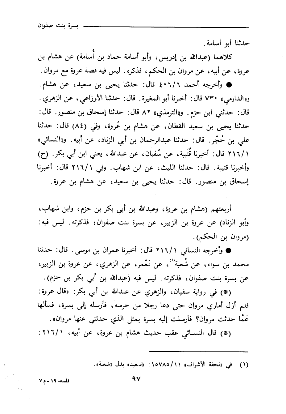- في رواية سفيان، والزهري عن عبد الله بن أبي بكر: قال عروة: فلم أزل أماري مروان حتى دعا رجلا من حرسه، فأرسله إلى بسرة، فسألها عَمًا حدثت مروان؟ فأرسلت إليه بسرة بمثل الذي حدثني عنها مروان.