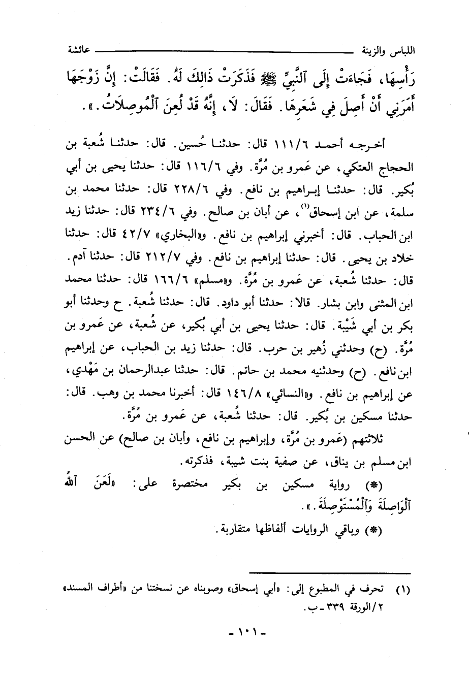 أخرجه أحمد ٦/ ١١١ قال: حدثنا حُسين. قال: حدثنا شُعبة بن الحجاج العتكي، عن عَمرو بن مُرَّة. وفي ٦/ ١١٦ قال: حدثنا يحيى بن أبي بُكير. قال: حدثنا إبراهيم بن نافع. وفي ٦/ ٢٢٨ قال: حدثنا محمد بن سلمة، عن ابن إسحاق، عن أبان بن صالح. وفي ٦/ ٢٣٤ قال: حدثنا زيد بن الحباب. قال: أخبرني إبراهيم بن نافع. و (البخاري) ٧/ ٤٢ قال: حدثنا خلاد بن يحيى. قال: حدثنا إبراهيم بن نافع. وفي ٧/ ٢١٢ قال: حدثنا آدم. قال: حدثنا شعبة، عن عَمرو بن مُرَّة. و"مسلم" ٦/ ١٦٦ قال: حدثنا محمد بن المثنى وابن بشار. قالا: حدثنا أبو داود. قال: حدثنا شُعبة. ح وحدثنا أبو بكر بن أبي شَيْبة. قال: حدثنا يحيى بن أبي بُكير، عن شُعبة، عن عَمرو بن مُرَّة (ح) وحدثني زُهير بن حرب. قال: حدثنا زيد بن الحباب، عن إبراهيم بن نافع (ح) وحدثنيه محمد بن حاتم. قال: حدثنا عبد الرحمن بن مَهْدي، عن إبراهيم بن نافع. و (النسائي) ٨/ ١٤٦ قال: أخبرنا محمد بن وهب. قال: حدثنا مسكين بن بُكير. قال: حدثنا شُعبة، عن عَمرو بن مُرة.