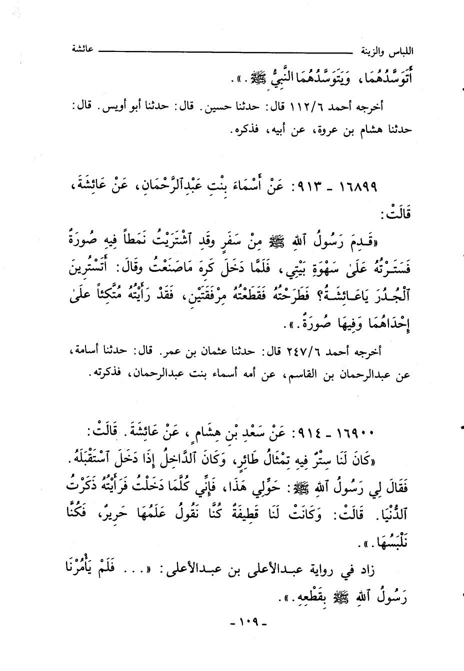 ١٦٨٩٩ - عَنْ أَسْمَاءَ بِنْتِ عَبْدِ الرَّحْمَنِ عَنْ عَائِشَةَ قَالَتْ: