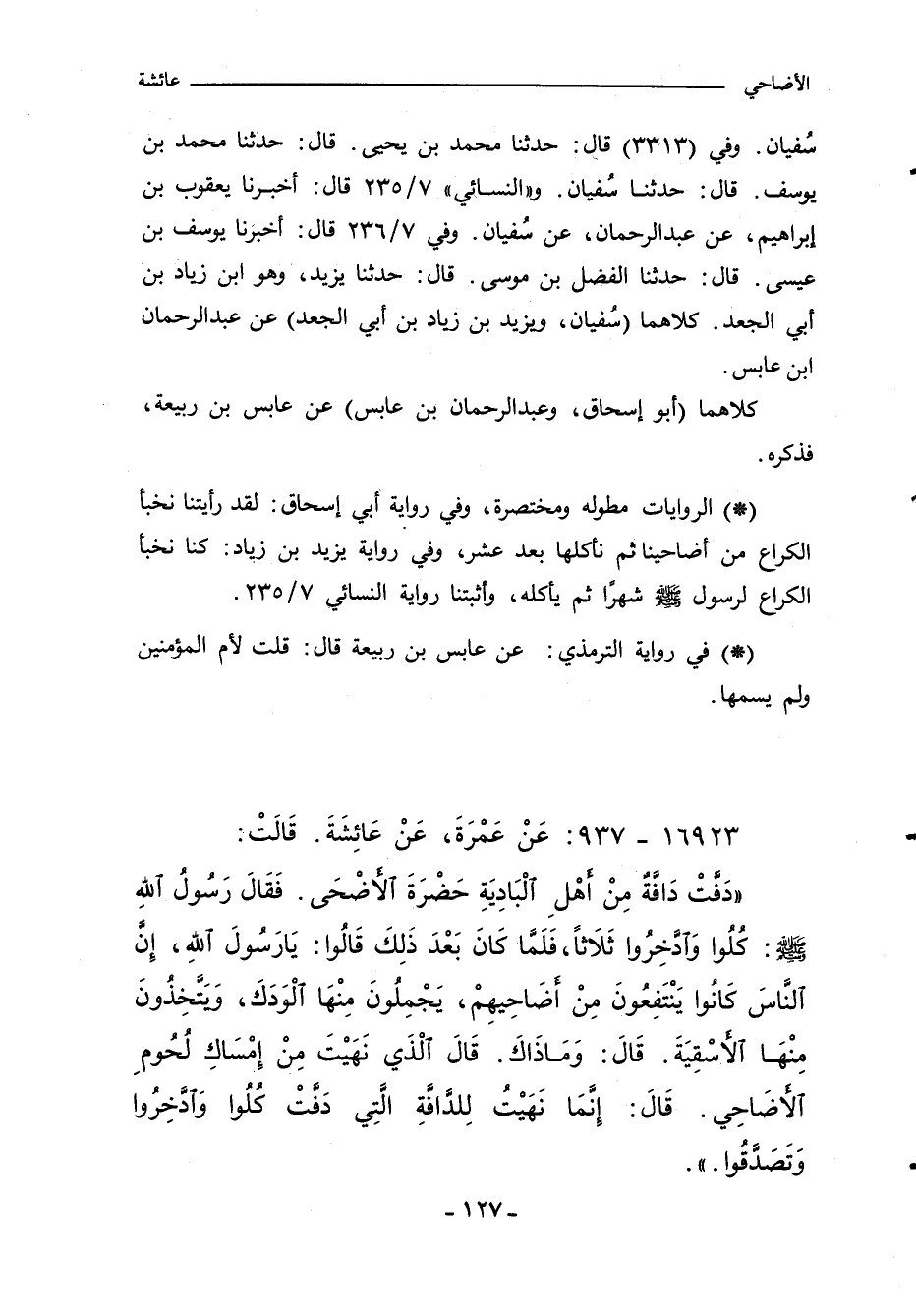 -الروايات مطوله ومختصرة، وفي رواية أبي إسحاق: لقد رأيتنا نخبأ الكراع من اضاحينا ثم نأكلها بعد عشر، وفي رواية يزيد بن زياد: كنا نخبأ الكراع لرسول صلى الله عليه وسلم شهرًا ثم يأكله، وأثبتنا رواية النَّسائي ٧/ ٢٣٥.