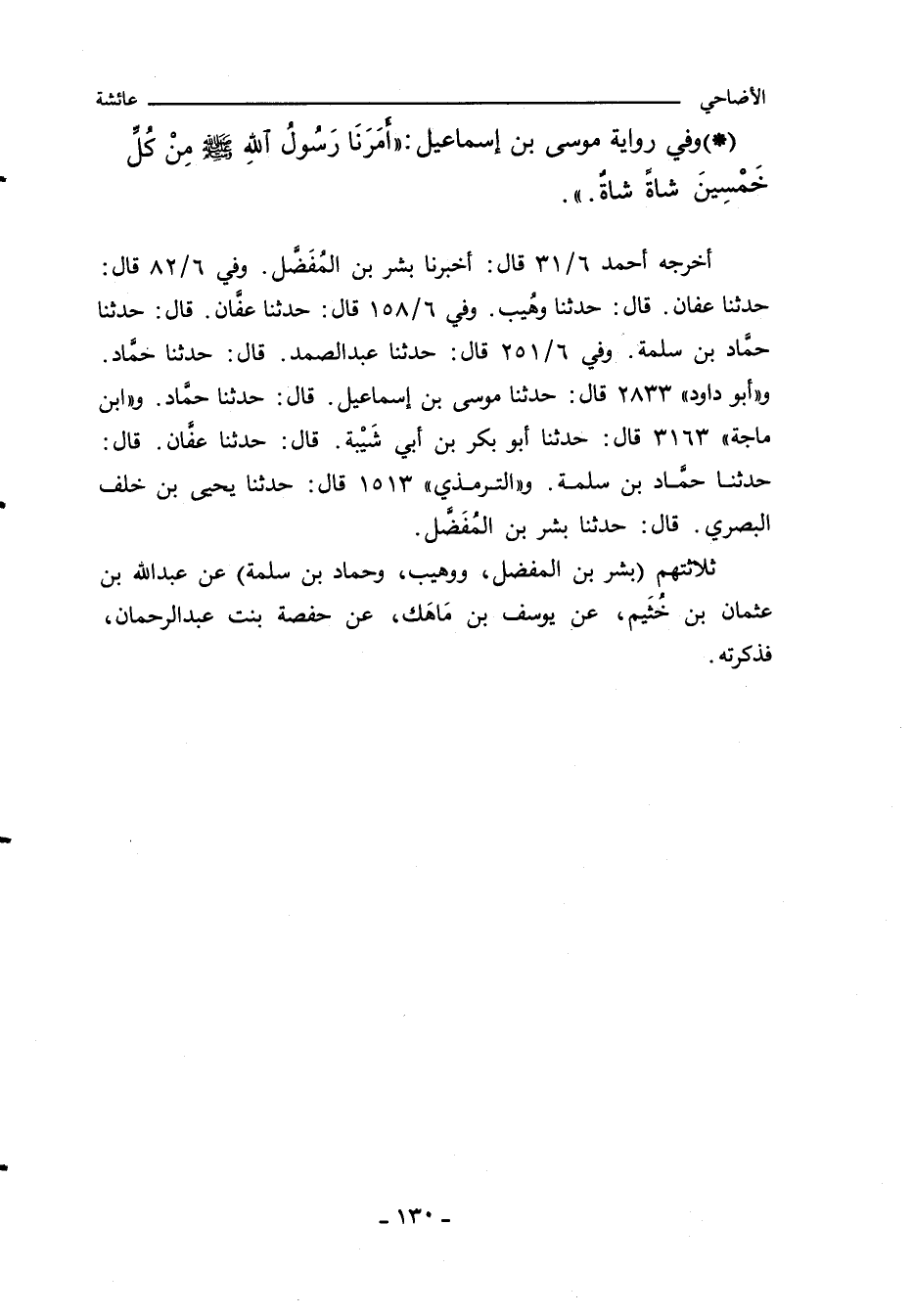 أخرجه أحمد ٦/ ٣١ قال: أخبرنا بشر بن المُفَضَّل. وفي ٦/ ٨٢ قال: حدثنا عفان. قال: حدثنا وهُيب. وفي ٦/ ١٥٨ قال: حدثنا عفَّان. قال: حدثنا حماد بن سلمة. وفي ٦/ ٢٥١ قال: حدثنا عبد الصمد. قال: حدثنا حمَّاد. و"أبو داود" ٢٨٣٣ قال: حدثنا موسى بن إسماعيل. قال: حدثنا حمَّاد. و"ابن ماجة" ٣١٦٣ قال: حدثنا أبو بكر بن أبي شَيْبة. قال: حدثنا عفَّان. قال: حدثنا حمَّاد بن سلمة. و (الترمذي) ١٥١٣ قال: حدثنا يحيى بن خلف البصري. قال: حدثنا بشر بن المُفَضَّل.