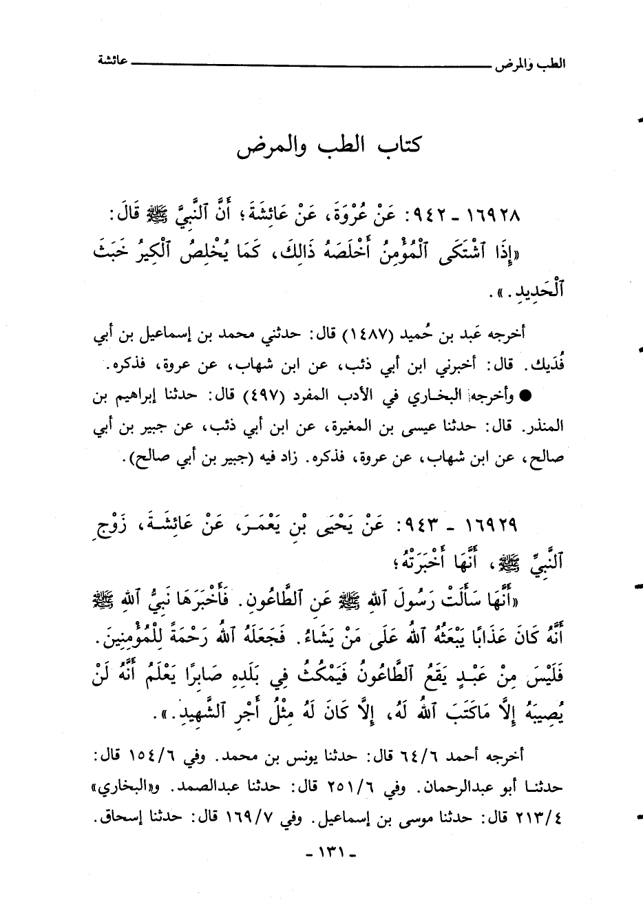 ١٦٩٢٩ - عَنْ يَحْيَى بْنِ يَعْمَرَ عَنْ عَائِشَةَ زَوْجِ النَّبِىِّ صلى الله عليه وسلم أَنَّهَا أَخْبَرَتْهُ أَنَّهَا سَأَلَتْ نَبِىَّ اللَّهِ صلى الله عليه وسلم عَنِ الطَّاعُونِ فَأَخْبَرَهَا نَبِىُّ اللَّهِ صلى الله عليه وسلم أَنَّهُ كَانَ عَذَابًا يَبْعَثُهُ اللَّهُ عَزَّ وَجَلَّ عَلَى مَنْ يَشَاءُ فَجَعَلَهُ اللَّهُ عَزَّ وَجَلَّ رَحْمَةً لِلْمُؤْمِنِينَ فَلَيْسَ مِنْ عَبْدٍ يَقَعُ الطَّاعُونُ فِيهِ فَيَمْكُثُ فِى بَلَدِهِ صَابِرًا مُحْتَسِبًا يَعْلَمُ أَنَّهُ لَمْ يُصِبْهُ إِلَاّ مَا كَتَبَ اللَّهُ عَزَّ وَجَلَّ لَهُ إِلَاّ كَانَ لَهُ مِثْلُ أَجْرِ الشَّهِيدِ.