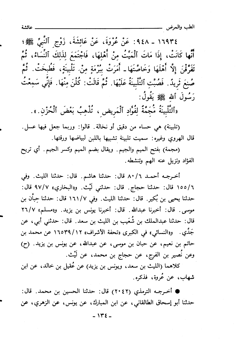 ١٦٩٣٤ - عَنْ عُرْوَةَ عَنْ عَائِشَةَ قَالَتْ كَانَتْ إِذَا أُصِيبَ أَحَدٌ مِنْ أَهْلِهَا فَتَفَرَّقَ نِسَاءُ الْجَمَاعَةِ عَنْهَا وَبَقِىَ نِسَاءُ أَهْلِ خَاصَّتِهَا أَمَرَتْ بِبُرْمَةٍ مِنْ تَلْبِينَةٍ فَطُبِخَتْ ثُمَّ أَمَرَتْ بِثَرِيدٍ فَيُثْرَدُ وَصَبَّتِ التَّلْبِينَةَ عَلَى الثَّرِيدِ ثُمَّ قَالَتْ كُلُوا مِنْهَا فَإِنِّى سَمِعْتُ رَسُولَ اللَّهِ صلى الله عليه وسلم يَقُولُ إِنَّ التَّلْبِينَةَ مَجَمَّةٌ لِفُؤَادِ الْمَرِيضِ تُذْهِبُ بَعْضَ الْحُزْنِ.