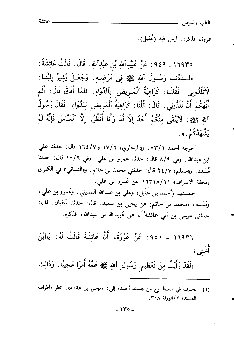 ١٦٩٣٥ - عَنْ عُبَيْدِ اللَّهِ بْنِ عَبْدِ اللَّهِ قَالَ قَالَتْ عَائِشَةُ لَدَدْنَا رَسُولَ اللَّهِ صلى الله عليه وسلم فِى مَرَضِهِ، وَجَعَلَ يُشِيرُ إِلَيْنَا لا تَلُدُّونِى. قَالَ فَقُلْنَا كَرَاهِيَةُ الْمَرِيضِ بِالدَّوَاءِ، فَلَمَّا أَفَاقَ قَالَ أَلَمْ أَنْهَكُمْ أَنْ تَلُدُّونِى. قَالَ قُلْنَا كَرَاهِيَةٌ لِلدَّوَاءِ. فَقَالَ رَسُولُ اللَّهِ صلى الله عليه وسلم لا يَبْقَى مِنْكُمْ أَحَدٌ إِلَاّ لُدَّ - وَأَنَا أَنْظُرُ - إِلَاّ الْعَبَّاسَ فَإِنَّهُ لَمْ يَشْهَدْكُمْ.