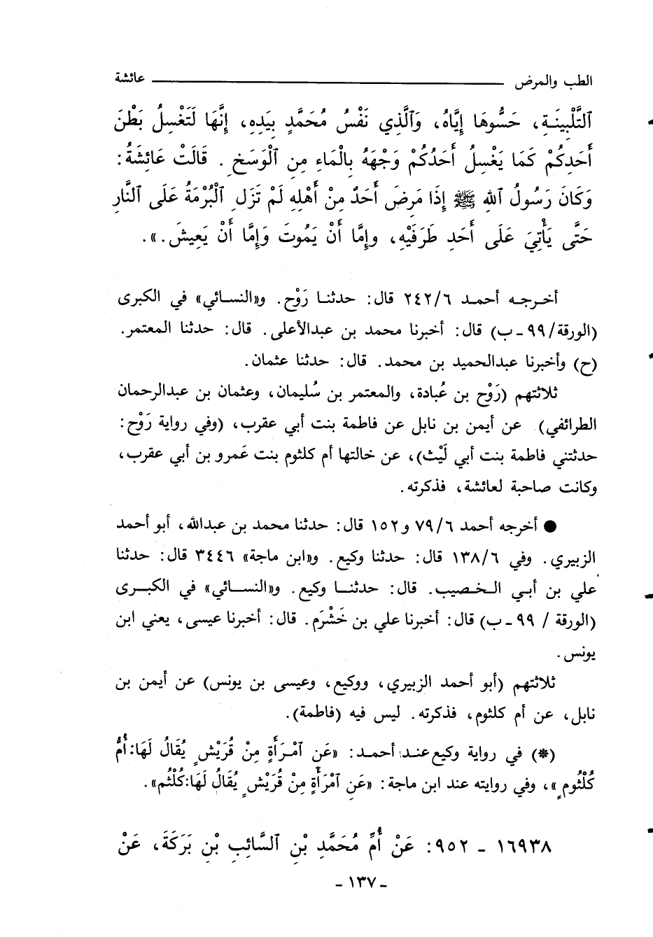 ثلاثتهم (رَوْح بن عُبادة، والمعتمر بن سليمان، وعثمان بن عبد الرحمن الطرائفي) عن أيمن بن نابل عن فاطمة بنت أبي عقرب، (وفي رواية رَوْح: حدثتني فاطمة بنت أبي لَيْث)، عن خالتها أم كلثوم بنت عَمرو بن أبي عقرب، وكانت صاحبة لعائشة، فذكرته ..