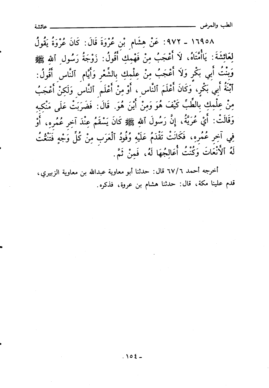 ١٦٩٥٨ - عَنْ هِشَامُ بْنُ عُرْوَةَ قَالَ كَانَ عُرْوَةُ يَقُولُ لِعَائِشَةَ يَا أُمَّتَاهُ لا أَعْجَبُ مِنْ فِقْهِكِ أَقُولُ زَوْجَةُ رَسُولِ اللَّهِ صلى الله عليه وسلم وَبِنْتُ أَبِى بَكْرٍ وَلا أَعْجَبُ مِنْ عِلْمِكِ بِالشِّعْرِ وَأَيَّامِ النَّاسِ أَقُولُ ابْنَةُ أَبِى بَكْرٍ وَكَانَ أَعْلَمَ النَّاسِ أَوْ مِنْ أَعْلَمِ النَّاسِ وَلَكِنْ أَعْجَبُ مِنْ عِلْمِكِ بِالطِّبِّ كَيْفَ هُوَ وَمِنْ أَيْنَ هُوَ قَالَ فَضَرَبَتْ عَلَى مَنْكِبِهِ وَقَالَتْ أَىْ عُرَيَّةُ إِنَّ رَسُولَ اللَّهِ صلى الله عليه وسلم كَانَ يَسْقَمُ عِنْدَ آخِرِ عُمْرِهِ - أَوْ فِى آخِرِ عُمْرِهِ - فَكَانَتْ تَقْدَمُ عَلَيْهِ وُفُودُ الْعَرَبِ مِنْ كُلِّ وَجْهٍ فَتَنْعَتُ لَهُ الأَنْعَاتَ وَكُنْتُ أُعَالِجُهَا لَهُ فَمِنْ ثَمَّ.
