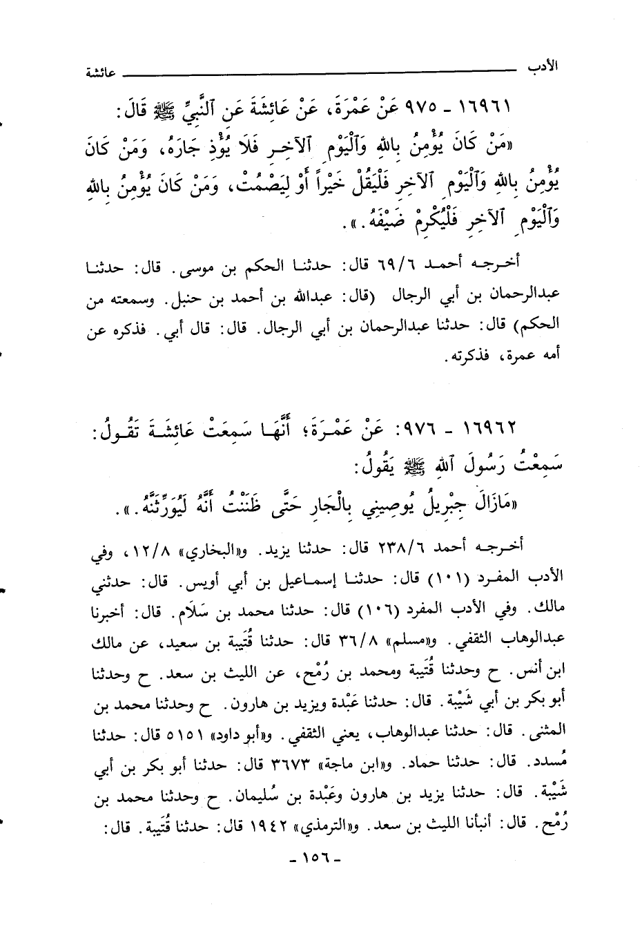 أخرجه أحمد ٦/ ٦٩ قال: حدثنا الحكم بن موسى. قال: حدثنا عبد الرحمن بن أبي الرجال (قال: عبد اللهِ بن أحمد بن حنبل. وسمعته من الحكم) قال: حدثنا عبد الرحمن بن أبي الرجال. قال: قال أبي. فذكره عن أمه عمرة، فذكرته.