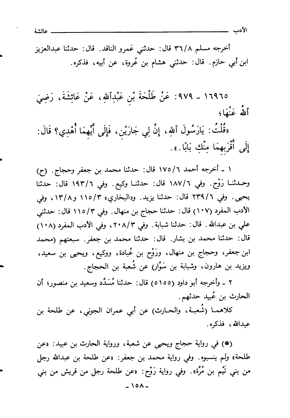 ١ - أخرجه أحمد ٦/ ١٧٥ قال: حدثنا محمد بن جعفر وحجاج (ح) وحدثنا روح. وفي ٦/ ١٨٧ قال: حدثنا وكيع. وفي ٦/ ١٩٣ قال: حدثنا يحيى. وفي ٦/ ٢٣٩ قال: حدثنا يزيد. و"البُخَارِي" ٣/ ١١٥ و ٨/ ١٣، وفي (الأدب المفرد) (١٠٧) قال: حدثنا حجاج بن منهال. وفي ٣/ ١١٥ قال: حدثني علي بن عبد اللهِ. قال: حدثنا شبابة. وفى ٣/ ٢٠٨، وفى (الأدب المفرد) (١٠٨) قال. . حدثنا محمد بن بشار. قال: حدثنا محمد بن جعفر. سبعتهم (محمد بن جعفر، وحجاج بن منهال، ورَوْح بن عُبادة، ووكيع، ويحيى بن سعيد، ويزيد بن هارون، وشبابة بن سَوَّار) عن شُعبة بن الحجاج.