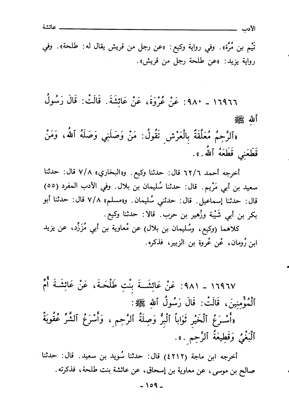 أخرجه أحمد ٦/ ٦٢ قال: حدثنا وكيع. و"البُخَارِي" ٨/ ٧ قال: حدثنا سعيد بن أبي مَرْيم. قال: حدثنا سُليمان بن بلال. وفي (الأدب المفرد) (٥٥) قال: حدثنا إسماعيل. قال: حدثني سُليمان. و"مسلم" ٨/ ٧ قال: حدثنا ابو بكر بن أبي شَيْبة وزُهير بن حرب. قالا: حدثنا وكيع.
