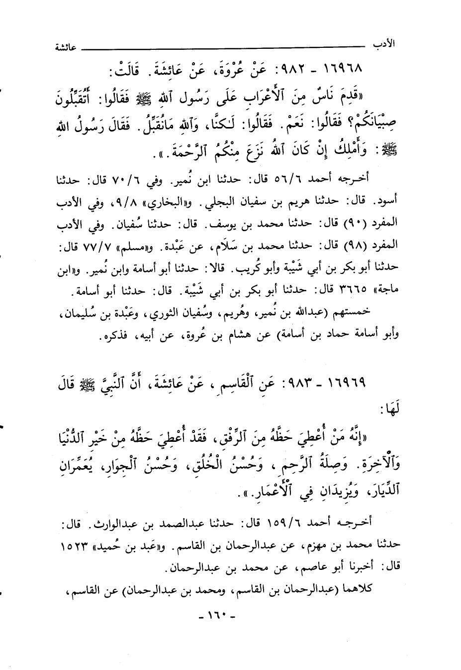 أخرجه أحمد ٦/ ٥٦ قال: حدثنا ابن نمير. وفي ٦/ ٧٠ قال: حدثنا اسود. قال: حدثنا هريم بن سفيان البجلي. و"البُخَارِي" ٨/ ٩، وفي (الأدب المفرد) (٩٠) قال: حدثنا محمد بن يوسف. قال: حدثنا سُفيان. وفي (الأدب المفرد) (٩٨) قال: حدثنا محمد بن سَلام، عن عَبْدة. و"مسلم" ٧/ ٧٧ قال: حدثنا ابو بكر بن أبي شَيْبة وأبو كُريب. قالا: حدثنا ابو أُسامة وابن نُمير. و"ابن ماجة" ٣٦٦٥ قال: حدثنا ابو بكر بن أبي شَيْبة. قال: حدثنا ابو أُسامة.