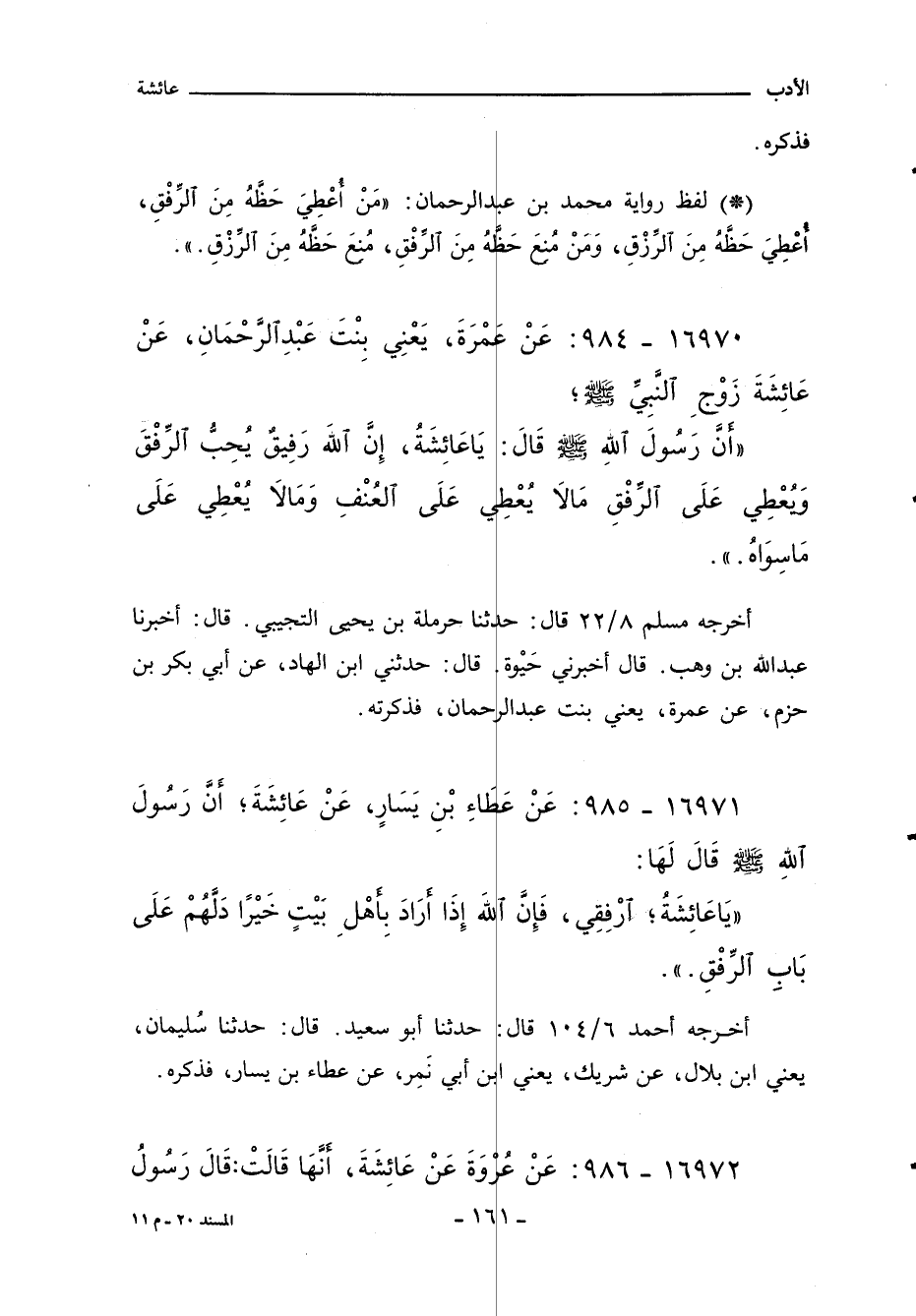 أَنَّ رَسُولَ اللهِ صلى الله عليه وسلم قَالَ: يَاعَائِشَةُ، إِنَّ اللهَ رَفِيقٌ يُحِبُّ الرِّفْقَ وُيعْطِي عَلَى الرِّفْقِ مَالا يُعْطِي عَلَى العُنْفِ وَمَالا يُعْطِي عَلَى مَاسِوَاهُ.