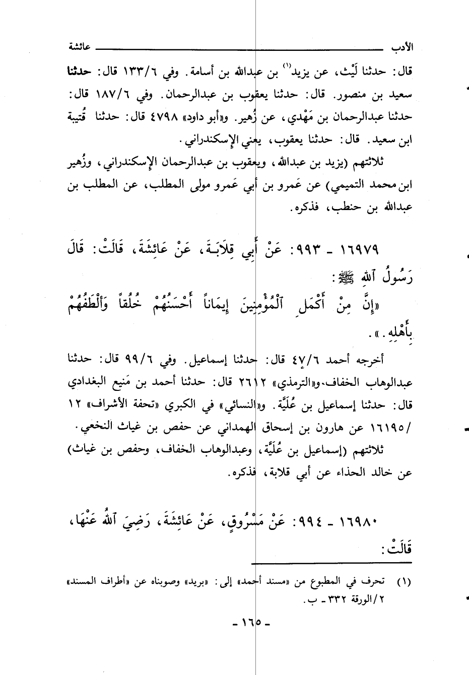 أخرجه أحمد ٦/ ٤٧ قال: حدثنا إسماعيل. وفي ٦/ ٩٩ قال: حدثنا عبد الوهاب الخفاف و"التِّرمِذي" ٢٦١٢ قال: حدثنا أحمد بن مَنيع البغدادي قال: حدثنا إسماعيل بن عُلَيَّة. و"النَّسائي" في الكبري تحفة الاشراف ١٢/ ١٦١٩٥ عن هارون بن إسحاق الهمداني عن حفص بن غياث النخعي.