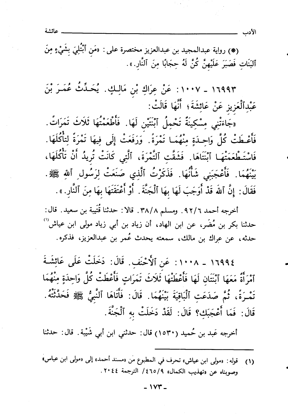 - رواية عبد المجيد بن عبد العزيز مختصرة على: مَنِ ابْتُلِيَ بِشَيْءٍ مِنَ البَنَاتِ فَصَبَرَ عَلَيْهِنَّ كُنَّ لَهُ حِجَابًا مِنَ النَارِ.
