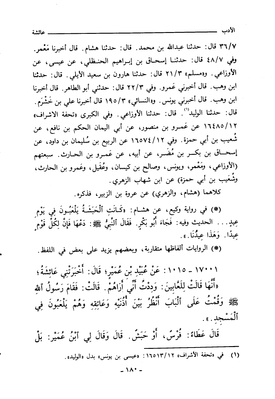 ٧/ ٣٦ قال: حدثنا عبد الله بن محمد. قال: حدثنا هشام. قال أخبرنا مَعْمر. وفي ٧/ ٤٨ قال: حدثنا إسحاق بن إبراهيم الحنظلي، عن عيسى، عن الاوزاعي. و"مسلم" ٣/ ٢١ قال: حدثنا هارون بن سعيد الايلي. قال: حدثنا ابن وهب. قال أخبرني عَمرو. وفي ٣/ ٢٢ قال: حدثني ابو الطاهر. قال أخبرنا ابن وهب. قال أخبرني يونس. و"النَّسائي" ٣/ ١٩٥ قال أخبرنا علي بن خَشْرَم. قال: حدثنا الوليد. قال: حدثنا الاوزاعي. وفي "الكبرى" تحفة الاشراف ١٢/ ١٦٤٨٥ عن عَمرو بن منصور، عن أبي اليمان الحكم بن نافع، عن شُعيب بن أبي حمزة. وفي ١٢/ ١٦٥٧٤ عن الربيع بن سُليمان بن داود، عن إسحاق بن بكر بن مُضَر، عن أَبيه، عن عَمرو بن الحارث. سبعتهم (الاوزاعي، ومَعْمر، ويونس، وصالح بن كيسان، وعُقَيل، وعَمرو بن الحارث، وشُعَيب بن أبي حمزة) عن ابن شهاب الزهري.