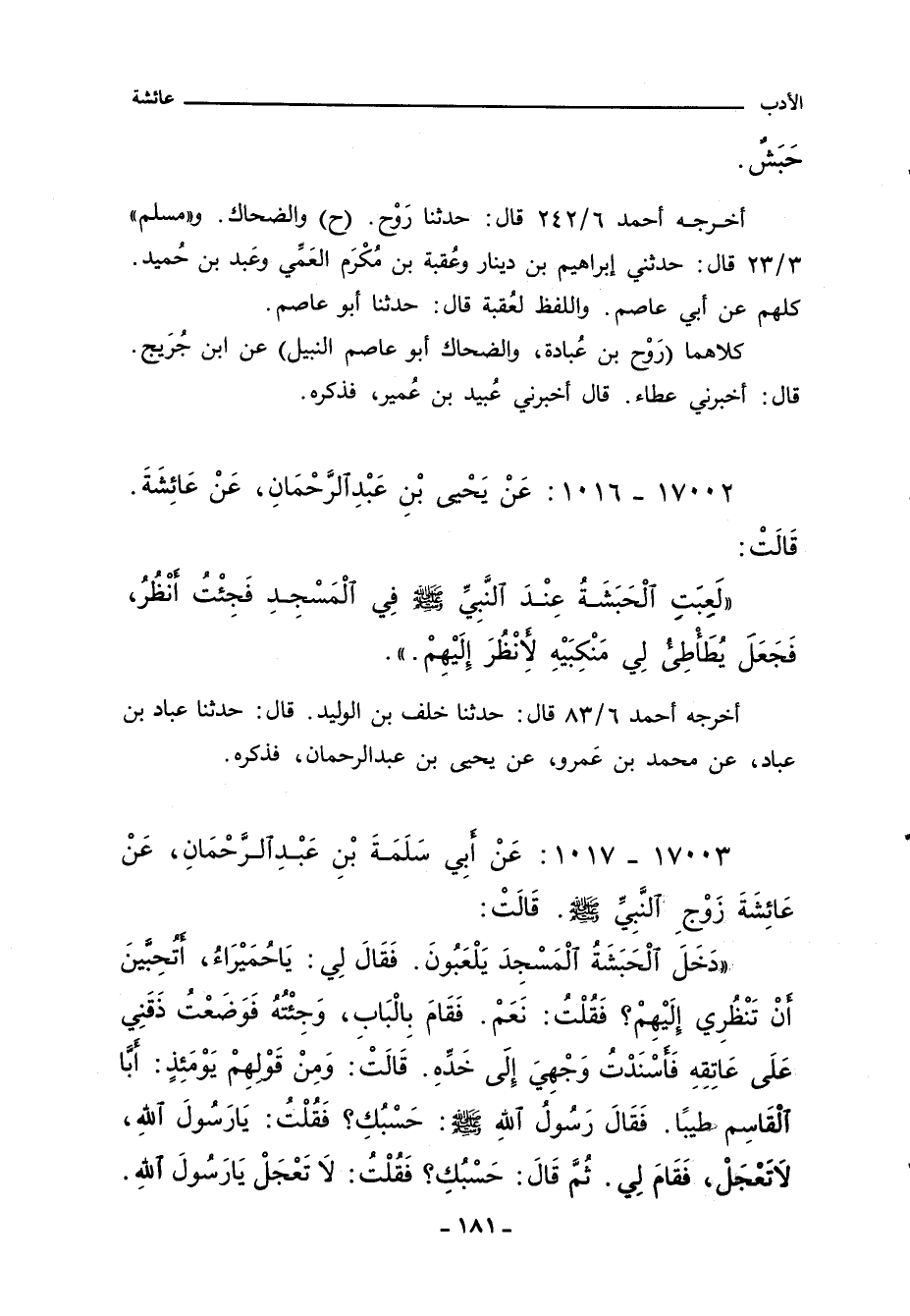 ١٧٠٠٣ - عَنْ أبي سَلَمَةَ بْنِ عَبْدِ الرَّحْمانِ، عَنْ عَائِشَةَ زَوْجِ النَّبِيِّ صلى الله عليه وسلم. قَالَتْ: دَخَلَ الْحَبَشَةُ الْمَسْجِدَ يَلْعَبُونَ. فَقَالَ لِي: يَاحُمَيْرَاءُ، اتُحِبَّينَ أَنْ تَنْظُرِي إِلَيْهِمْ؟ فَقُلْتُ: نَعَمْ. فَقَامَ بِالْبَابِ، وَجِئْتُهُ فَوَضَعْتُ ذَقَنِي عَلَى عَاتِقِهِ فَاسْنَدْتُ وَجْهِيَ إِلَى خَدِّهِ. قَالَتْ: وَمِنْ قَوْلِهِمْ يَوْمَئِذٍ: ابَا الْقَاسِم طيبًا. فَقَالَ رَسُولُ اللهِِ صلى الله عليه وسلم: حَسْبُكِ؟ فَقُلْتُ: يَا رَسُولَ اللهِِ، لاتَعْجَلْ، فَقَامَ لِي. ثُمَّ قَالَ: حَسْبُكِ؟ فَقُلْتُ: لا تَعْجَلْ يَارَسُولَ اللهِِ.