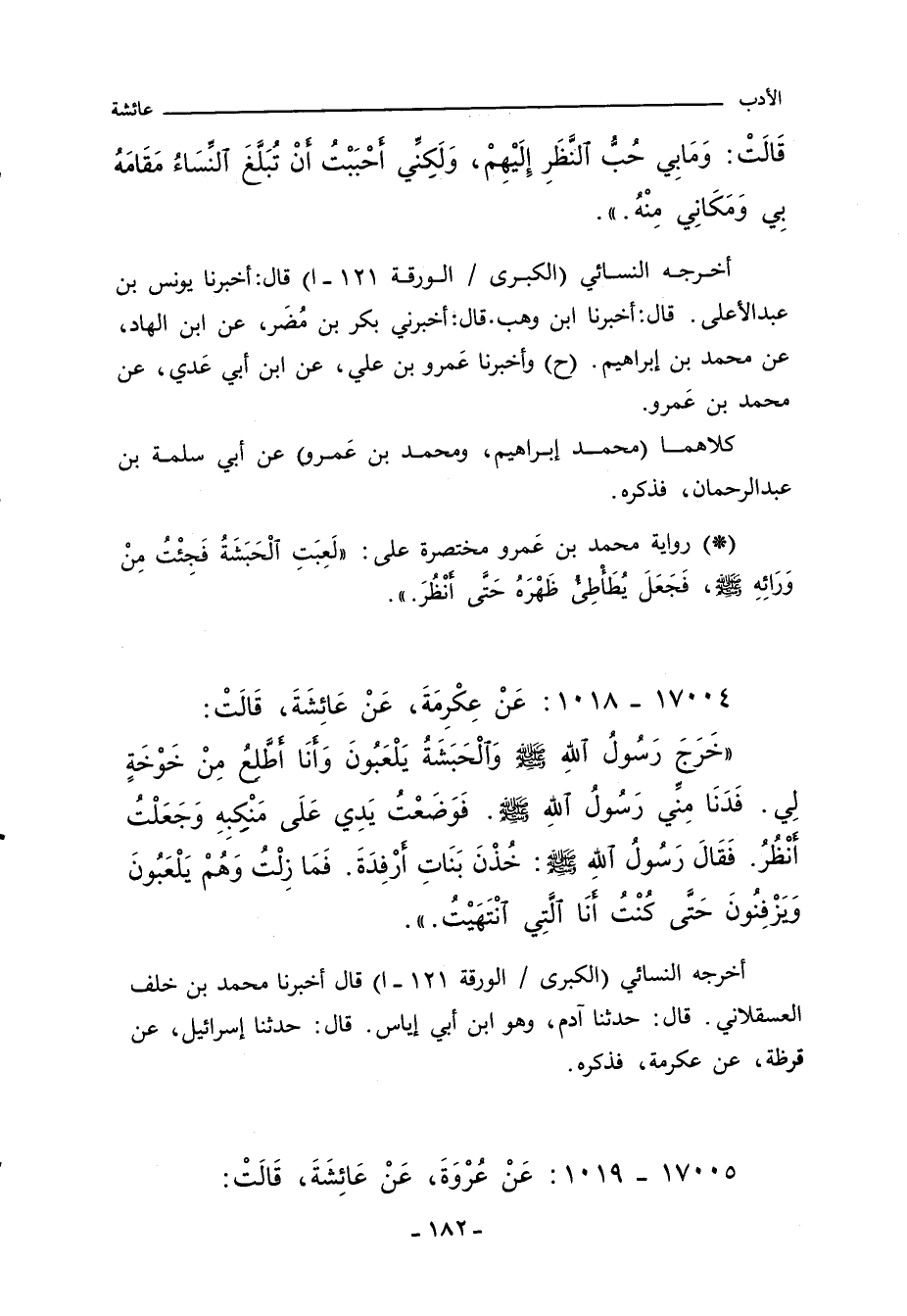 - رواية محمد بن عَمرو مختصرة على: لَعِبَتِ الْحَبَشَةُ فَجِئْتُ مِنْ وَرَائِهِ صلى الله عليه وسلم، فَجَعَلَ يُطَاْطِئُ ظَهْرَهُ حَتَّى انْظُرَ.