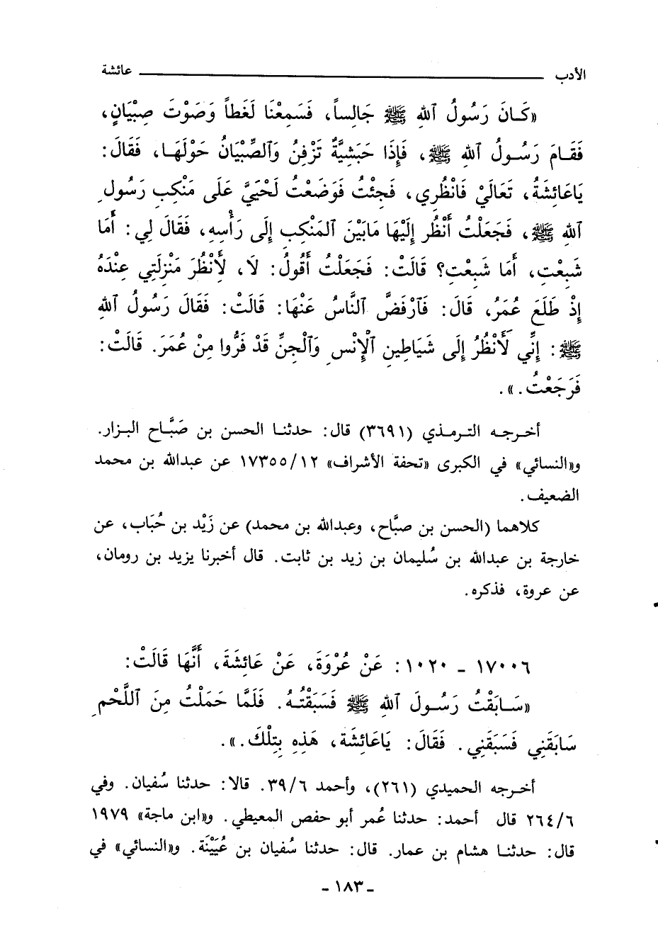 كَانَ رَسُولُ اللهِ صلى الله عليه وسلم جَالِسًا، فَسَمِعْنَا لَغَطًا وَصَوْتَ صِبْيَانٍ، فَقَامَ رَسُولُ اللهِ صلى الله عليه وسلم فَإِذَا حَبَشِيَّةٌ تَزْفِنُ وَالصِّبْيَانُ حَوْلَهَا، فَقَالَ: يَاعَائِشَةُ، تَعَالَيْ فَانْظُرِي، فَجِئْتُ فَوَضَعْتُ لَحْيًّ عَلَى مَنْكِبِ رَسُولِ الله صلى الله عليه وسلم، فَجَعَلْتُ انْظُر إِلَيْهَا مَابَيْنَ المَنْكِبِ إِلَى رَاْسِهِ، فَقَالَ لِي: امَا شَبِعْتِ، امَا شبِعْتِ؟ قَالَتْ: فَجَعَلْتُ اقُولُ: لا، لانْظُرَ مَنْزِلَتِي عِنْدَهُ إِذْ طَلَعَ عُمَرُ، قَالَ: فَارْفَضَّ النَّاسُ عَنْهَا: قَالَتْ: فَقَالَ رَسُولُ اللهِ صلى الله عليه وسلم: أبي لانْظُرُ إِلَى شَيَاطِينِ الإِنْسِ وَالْجِنِّ قَدْ فَرُّوا مِنْ عُمَرَ. قَالَتْ: فَرَجَعْت.