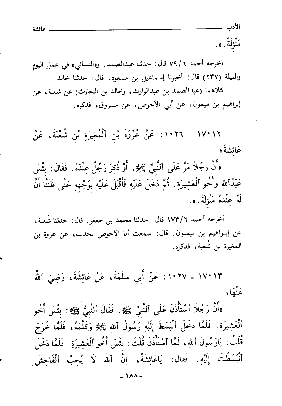 ١٧٠١٢ - عَنْ عُرْوَةَ بْنِ الْمُغِيرَةِ بْنِ شُعْبَةَ، عَنْ عَائِشَةَ؛