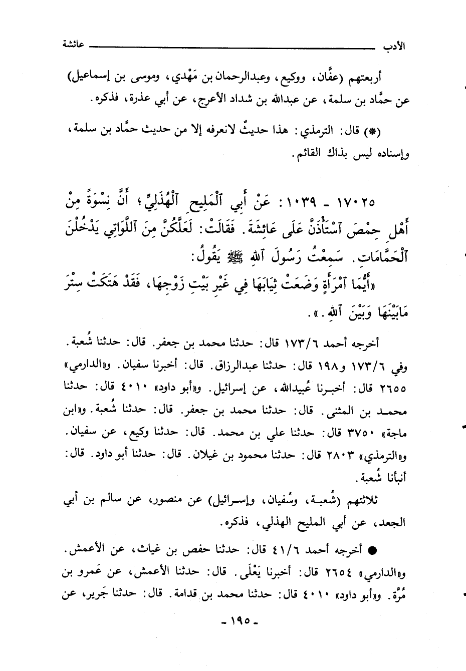 ١٧٠٢٥ - عَنْ أبي الْمَلِيحِ الْهُذَلِيِّ؛ أَنَّ نِسْوَةً مِنْ اهْلِ حِمْصَ اسْتَاْذَنَّ عَلَى عَائِشَةَ. فَقَالَتْ: لَعَلَّكُنَّ مِنَ اللَّوَاتِي يَدْخُلْنَ الْحَمَّامَاتِ. سَمِعْتُ رَسُولَ اللهِِ صلى الله عليه وسلم يَقُولُ: