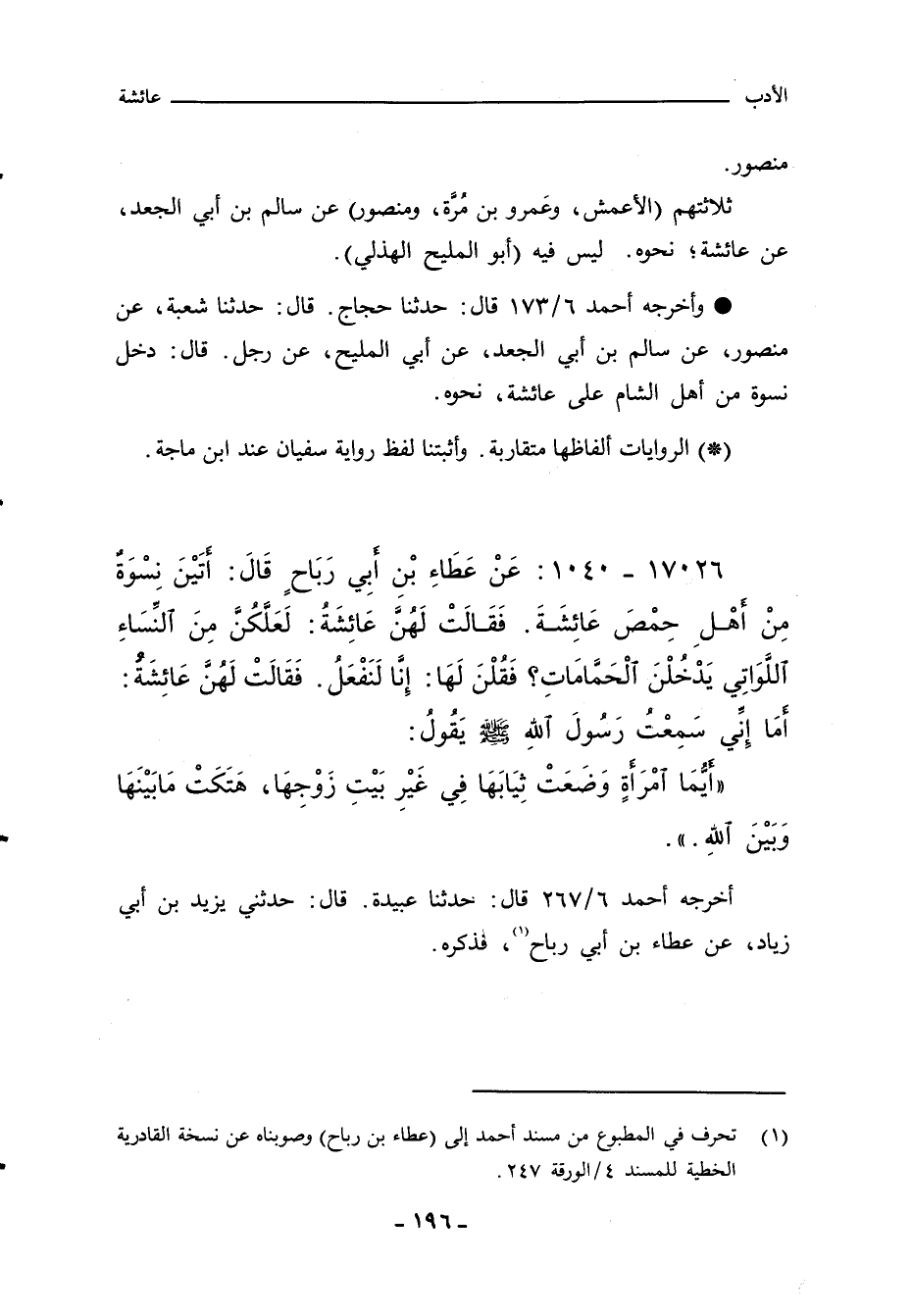 - وأخرجه أحمد ٦/ ١٧٣ قال: حدثنا حجاج. قال: حدثنا شعبة، عن منصور، عن سالم بن أبي الجعد، عن أَبي المليح، عن رجل. قال: دخل نسوة من اهل الشام على عائشة، نحوه.