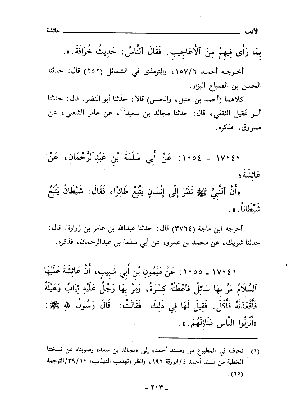 كلاهما (أحمد بن حنبل، والحسن) قالا: حدثنا ابو النضر. قال: حدثنا ابو عَقيل الثقفي، قال: حدثنا مجالد بن سعيد، عن عامر الشعبي، عن مسروق، فذكره.