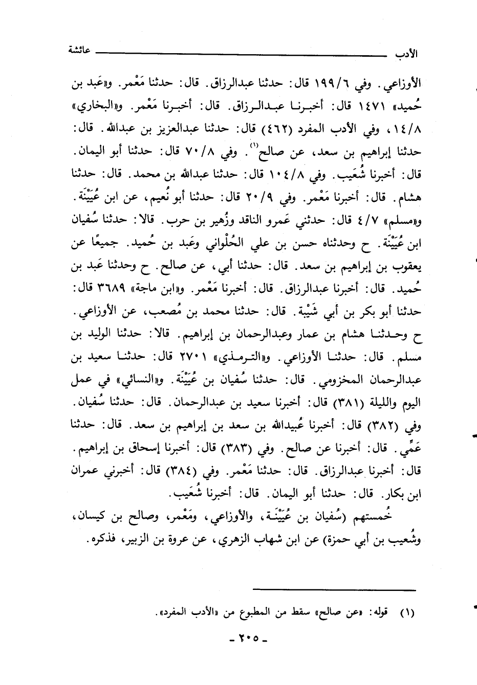 الاوزاعي. وفي ٦/ ١٩٩ قال: حدثنا عبد الرزاق. قال: حدثنا مَعْمر. وعَبد بن حُميد ١٤٧١ قال: أخبرنا عبد الرزاق. قال: أخبرنا مَعْمر. و"البُخَارِي" ٨/ ١٤، وفي (الأدب المفرد) (٤٦٢) قال: حدثنا عبد العزيز بن عبد الله. قال: حدثنا إبراهيم بن سعد، عن صالح. وفي ٨/ ٧٠ قال: حدثنا ابو اليمان. قال: أخبرنا شعَيب. وفي ٨/ ١٠٤ قال: حدثنا عبد الله بن محمد. قال: حدثنا هشام. قال: أخبرنا مَعْمر. وفي ٩/ ٢٠ قال: حدثنا ابو نعيم، عن ابن عُيَيْنَة. و"مسلم" ٧/ ٤ قال: حدثني عَمرو الناقد وزُهير بن حرب. قالا: حدثنا سُفيان بن عيَيْنة. ح وحدثناه حسن بن علي الحُلْواني وعَبد بن حُميد. جميعًا عن يعقوب بن إبراهيم بن سعد. قال: حدثنا أبي، عن صالح. ح وحدثنا عَبد بن حُميد. قال: أخبرنا عبد الرزاق. قال: أخبرنا مَعْمر. و"ابن ماجة" ٣٦٨٩ قال: حدثنا ابو بكر بن أبي شَيْبة. قال: حدثنا محمد بن مُصب، عن الاوزاعي. ح وحدثنا هشام بن عمار وعبد الرحمن بن إبراهيم. قالا: حدثنا الوليد بن مسلم. قال: حدثنا الاوزاعي. و"التِّرمِذي" ٢٧٠١ قال: حدثنا سعيد بن عبد الرحمن المخزومي. قال: حدثنا سُفيان بن عُيَيْنَة. و"النَّسائي" في عمل اليوم والليلة (٣٨١) قال: أخبرنا سعيد بن عبد الرحمن. قال: حدثنا سُفيان. وفي (٣٨٢) قال: أخبرنا عُبيد الله بن سعد بن إبراهيم بن سعد. قال: حدثنا عَمِّي. قال: أخبرنا عن صالح. وفي (٣٨٣) قال: أخبرنا إسحاق بن إبراهيم. قال: أخبرنا عبد الرزاق. قال: حدثنا مَعْمر. وفي (٣٨٤) قال: أخبرني عمران بن بكار. قال: حدثنا ابو اليمان. قال: أخبرنا شُعَيب.