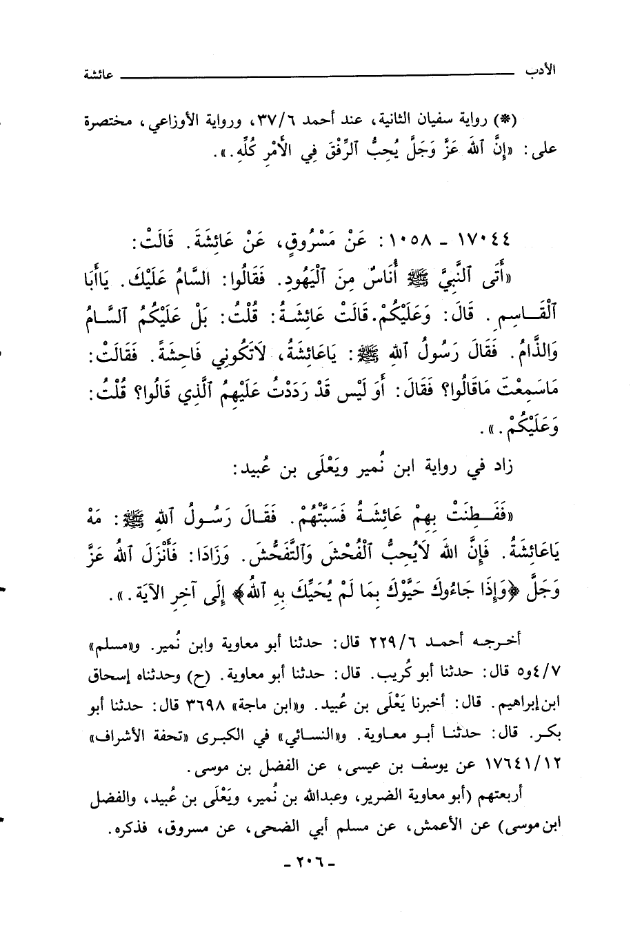 اتَى النَّبِيَّ صلى الله عليه وسلم اُنَّاسٌ مِنَ الْيَهُودِ. فَقَالُوا: السَّامُ عَلَيْكَ. يَا ابَا الْقَاسِمِ. قَالَ: وَعَلَيْكًمْ. قَالَتْ عَائِشَةُ: قُلْتُ: بَلْ عَلَيْكُمُ السَّامُ وَالذَّامُ. فَقَالَ رَسُولُ اللهِِ صلى الله عليه وسلم: يَاعَائِشَةُ، لاتَكُونِي فَاحِشَةً. فَقَالَتْ: مَاسَمِعْت مَاقَالُوا؟ فَقَالَ: اوَ لَيْس قَدْ رَدَدْتُ عَلَيْهِمُ الَّذِي قَالُوا؟ قُلْتُ: وَعَلَيْكُمْ.