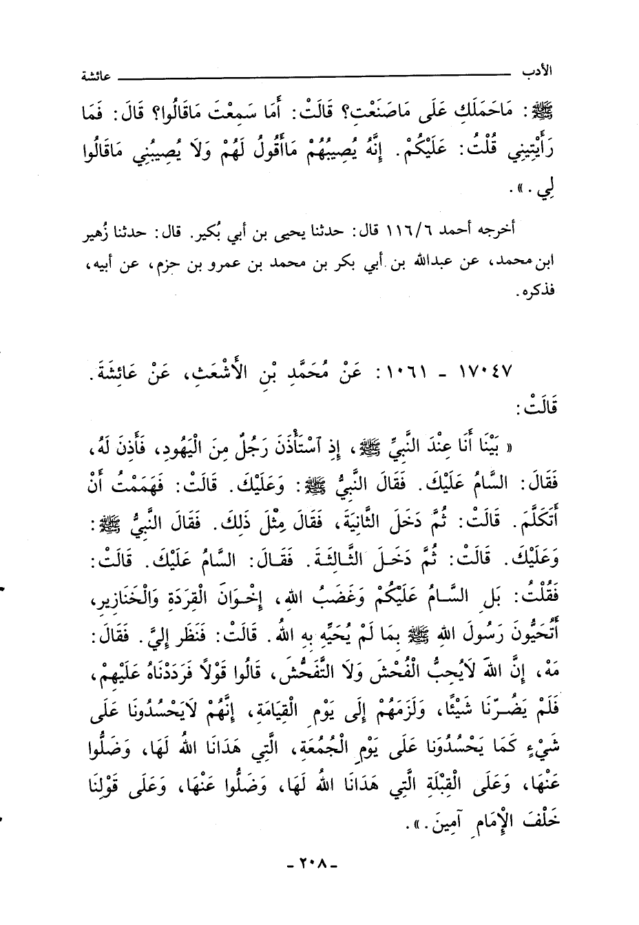 بَيْنَا انَّا عِنْدَ النَّبِيِّ صلى الله عليه وسلم، إِذِ اسْتَاْذَنَ رَجُلٌ مِنَ الْيَهُودِ، فَاذِنَ لَهُ، فَقَالَ: السَّامُ عَلَيْكَ. فَقَالَ النَّبِيُّ صلى الله عليه وسلم: وَعَلَيْكَ. قَالَتْ: فَهَمَمْتُ أَنْ اتَكَلَّمَ. قَالَتْ: ثُمَّ دَخَلَ الثَّانِيَةَ، فَقَالَ مِثْلَ ذَالِكَ. فَقَالَ النَّبِيُّ صلى الله عليه وسلم: وَعَلَيْكَ. قَالَتْ: ثُمَّ دَخَلَ الثَّالِثةَ. فَقَالَ: السَّامُ عَلَيْكَ. قَالَتْ: فَقُلْتُ: بَلِ السَّامُ عَلَيْكُمْ وَغَضَبُ اللهِ، إِِخْوَانَّ الْقِرَدَةِ وَالْخَنَازِيرِ، اتُحَيُّونَ رَسُولَ اللهِِ صلى الله عليه وسلم بِمَا لَمْ يُحَيِّهِ بِهِ اللَّهُ. قَالَتْ: فَنَظَر إِليَّ. فَقَالَ: مَهْ، إِنَّ اللهَ لايُحِبُّ الْفُحْشَ وَلا التَّفَحّشَ، قَالُوا قَوْلاً فَرَدَدْنَاة عَلَيْهِمْ، فَلَمْ يَضرّنَا شَيْئًا، وَلَزَمَهُمْ إِلَى يَوْمِ الْقِيَامَةِ، إِنَّهُمْ لايَحْسُدُونَا عَلَى شَيْءٍ كَمَا يَحْسُدُوَنا عَلَى يَوْمِ الْجُمُعَةِ، الَّتِي هَدَانَا اللَّهُ لَهَا، وَضَلُّوا عَنْهَا، وَعَلَى الْقِبْلَةِ الَّتِي هَدَانَا اللَّهُ لَهَا، وَضَلُّوا عَنْهَا، وَعَلَى قَوْلِنَا خَلْفَ الإِمَامِ امِينَ.