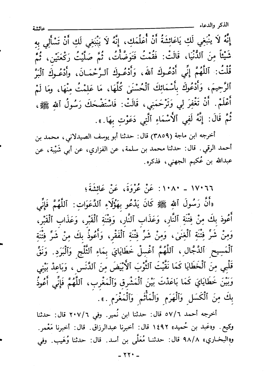 إَِنَّهُ لا ينْبَغِي لَكِ يَاعَائِشَةُ أَنْ اَعَلِّمَكِ، إِنَّهُ لا يَنْبَغِي لَكِ اَنْ تَسْاَلِي بِهِ شَيْئًا مِنَ الدُّنْيَا، قَالَتْ: فَقُمْتُ فَتَوَضَّاْتُ، ثُمَّ صَلَّيْتُ رَكْعَتَيْنِ، ثُمَّ َ قُلْتُ: اللَّهُمَّ إِنِّي ادْعًوكَ اللَّه، وَادْعًوكَ الرَّحْمَانَ، وادْعُوكَ الْبَرَّ الرَّحِيمَ، وَادْعُوكَ بِاسْمَائِكَ الْحُسْنَى كُلِّهَا، مَا عَلِمْتُ مِنْهَا، ومَا لَمْ اعْلَمْ. أَنْ تَغْفِرَ لِي وَتَرْحَمَنِي، قَالَتْ: فَاسْتَضْحَكَ رَسُولُ اللهِِ صلى الله عليه وسلم، ثُمَّ قَالَ: إِنَّهُ لَفِي الاسْمَاءِ الَّتِي دَعَوْتِ بِهَا. أخرجه ابن ماجة (٣٨٥٩) قال: حدثنا ابو يوسف الصيدلاني، محمد بن أحمد الرقي. قال: حدثنا محمد بن سلمة، عن الفزاري، عن أَبي شَيْبة، عن عبد الله بن عُكيم الجهني، فذكره.
