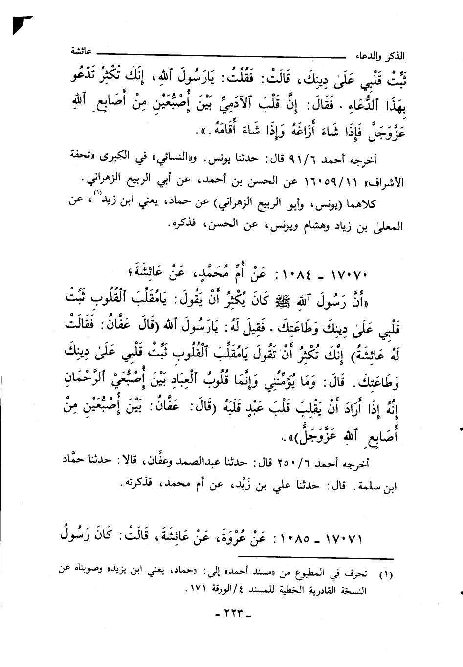 أَنَّ رَسُولَ اللهِِ صلى الله عليه وسلم كَانَ يُكْثِرُ أَنْ يَقُولَ: يَامُقَلِّبَ الْقُلُوبِ ثَبِّتْ قَلْبِي عَلَى دِينِكَ وَطَاعَتِكَ. فَقِيلَ لَهُ: يَارَسُولَ اللهِِ (قَالَ عَفَّانُ: فَقَالَتْ لَهُ عَائِشَةُ) إِنَّكَ تُكْثِرُ أَنْ تَقُولَ يَامُقَلِّبَ الْقُلُوبِ ثَبِّتْ قَلْبِي عَلَن دِينِكَ وَطَاعَتِكَ. قَالَ: وَمَا يُؤَمِّنُنِي وَإِنَّمَا قُلُوبُ الْعِبَادِ بَيْنَ إُِصْبُعَيْ الرَّحْمَانِ إِنَّهُ إِذَا ارَادَ أَنْ يَقْلِبَ قَلْبَ عَبْدٍ قَلَبَهُ (قَالَ: عَفَّانُ: بَيْنَ إُِصْبُعَيْنِ مِنْ اصَابِعَ اللَّه عَزَّ وَجَلًّ.