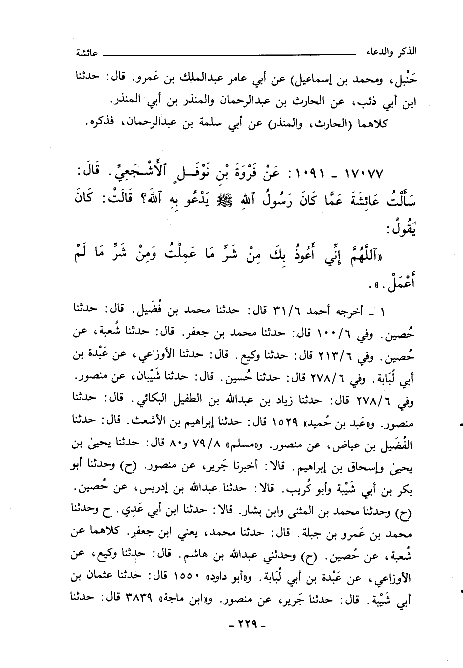 ١٧٠٧٧ - عَنْ فَرْوَةَ بْنِ نَوْفَلٍ الاشْجَعِيِّ. قَالَ: سَالْتُ عَائِشَةَ عَمَّا كَانَ رَسُولُ اللهِِ صلى الله عليه وسلم يَدْعُو بِهِ اللَّهَ؟ قَالَتْ: كَانَ يَقُولُ: