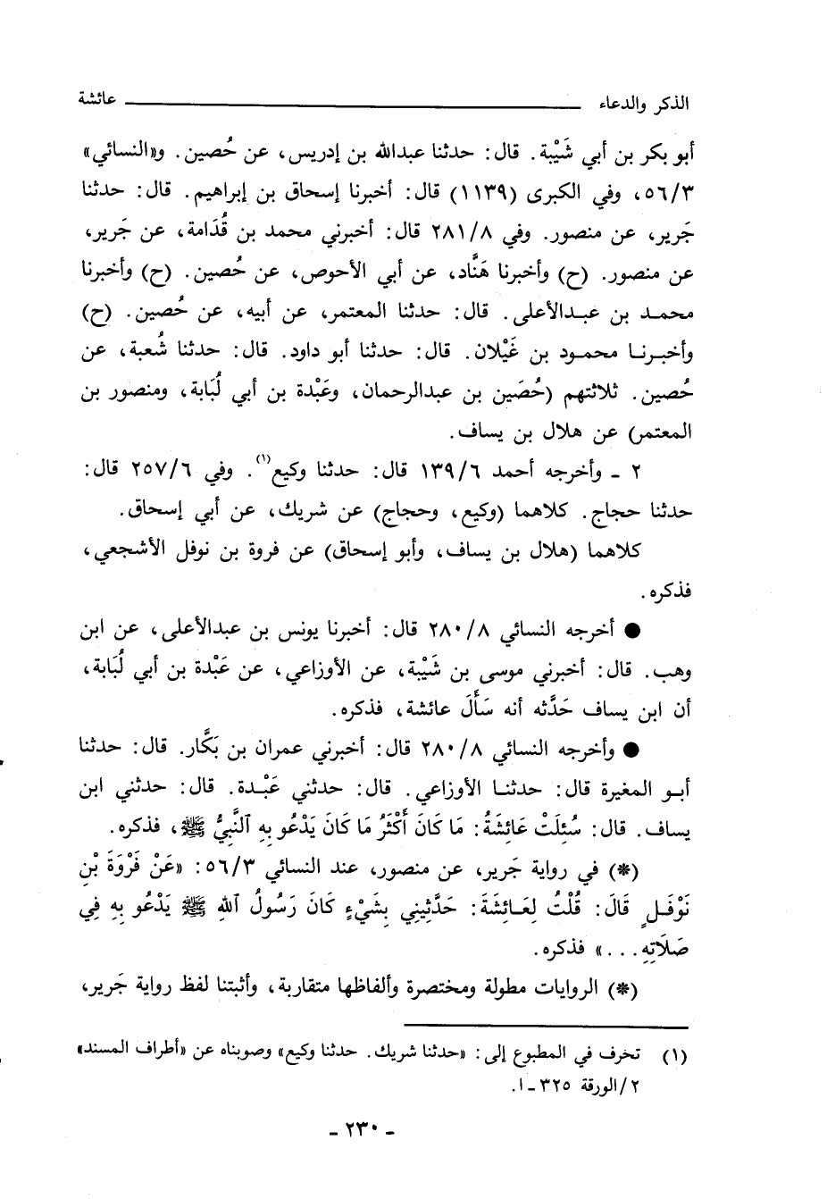 ابو بكر بن أبي شَيْبة. قال: حدثنا عبد الله بن ادريس، عن حُصين. و"النَّسائي" ٣/ ٥٦، وفي "الكبرى" (١١٣٩) قال: أخبرنا إسحاق بن إبراهيم. قال: حدثنا جَرير، عن منصور. وفي ٨/ ٢٨١ قال: أخبرني محمد بن قدَامة، عن جَرير، عن منصور (ح) واخبرنا هَنَّاد، عن أَبي الاحوص، عن حُصين (ح) واخبرنا محمد بن عبد الاعلى. قال: حدثنا المعتمر، عن أَبيه