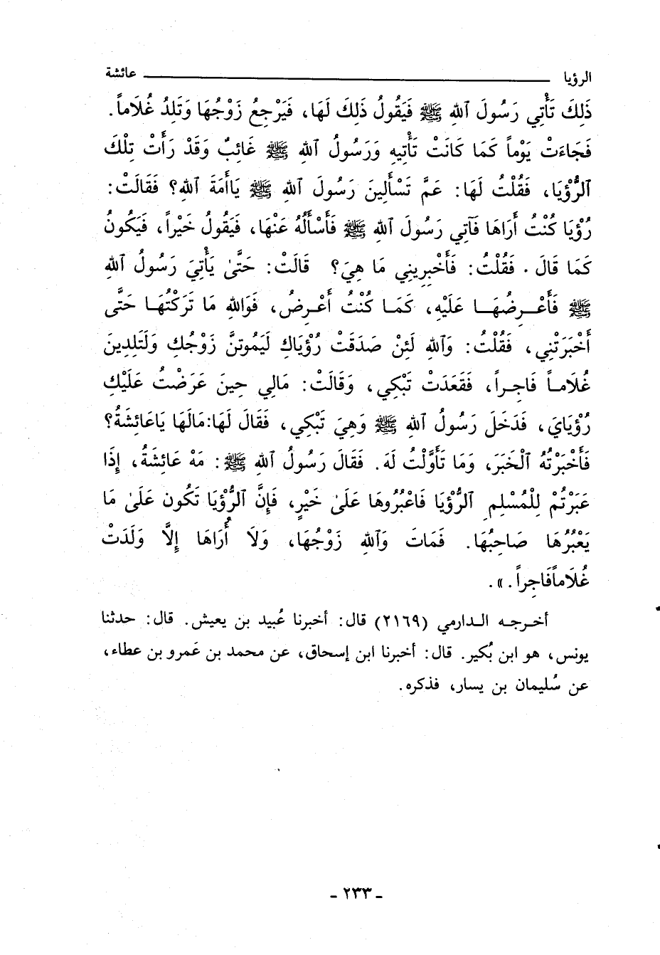 ذَالِكَ تَاْتِي رَسُولَ اللهِِ صلى الله عليه وسلم فَيَقُولُ ذَالِكَ لَهَا، فَيَرْجِعُ زَوْجُهَا وَتَلِدُ غُلامًا. فَجَاءَتْ يَوْمًا كَمَا كَانَتْ تَاْتِيهِ وَرَسُولُ اللهِِ صلى الله عليه وسلم غَائِبٌ وَقَدْ رَاْتْ تِلْكَ الرُّؤْيَا، فَقُلْتُ لَهَا: عَمَّ تَسْالِينَ رَسُولَ اللهِِ صلى الله عليه وسلم يَا امَةَ اللَّه؟ فَقَالَتْ: رُؤْيَا كُنْتُ ارَاهَا فَاتِي رَسُولَ اللهِِ صلى الله عليه وسلم فَاسْالُهُ عَنْهَا، فَيَقُولُ خَيْرًا، فَيَكُونُ كَمَا قَالَ. فَقُلْتُ: فَاخْبِرِينِي مَا هِيَ؟ قَالَتْ: حَتَّى يَاْتِيَ رَسُولُ اللهِِ صلى الله عليه وسلم فَاعْرِضُهَا عَلَيْهِ، كَمَا كُنْتُ اعْرِضُ، فَوَاللَّه مَا تَرَكْتُهَا حَتَّى اخْبَرَتْنِي، فَقُلْتُ: وَاللَّه لَئِنْ صَدَقَتْ رُؤْيَاكِ لَيَمُوتنَّ زَوْجُكِ وَلَتَلِدِينَ غُلامًا فَاجِرًا، فَقَعَدَتْ تَبْكِي، وَقَالَتْ: مَالِي حِينَ عَرَضْتُ عَلَيْكِ رُؤْيَايَ، فَدَخَلَ رَسُولُ اللهِِ صلى الله عليه وسلم وَهِيَ تَبْكِي، فَقَالَ لَهَا:
