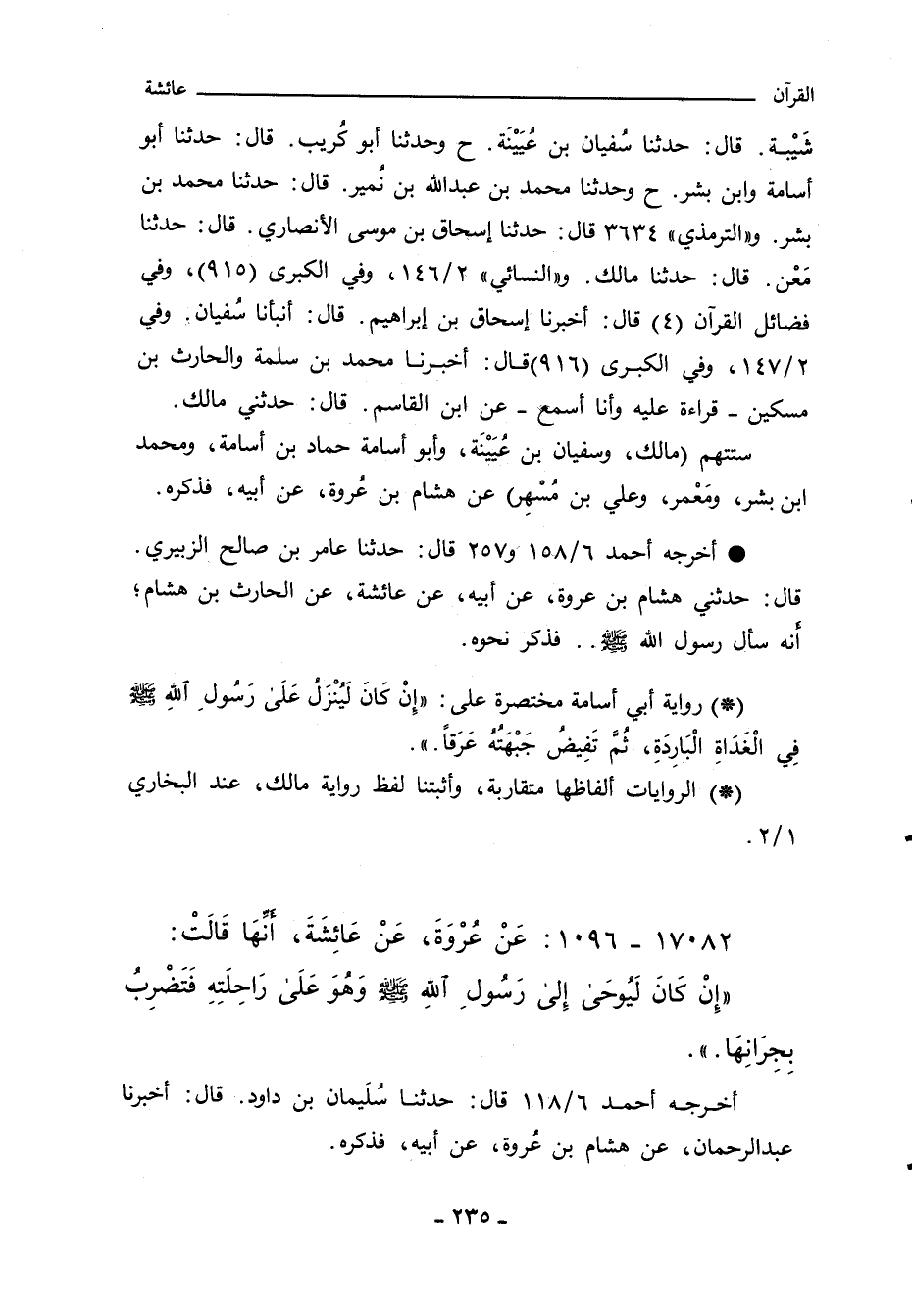 - رواية أبي أُسامة مختصرة على: إِنْ كَانَ لَيُنْزَلُ عَلَى رَسُولِ اللهِ صلى الله عليه وسلم فِي الْغَدَاةِ الْبَارِدَةِ، ثُمَّ تَفِيضُ جَبْهَتُهُ عَرَقا.