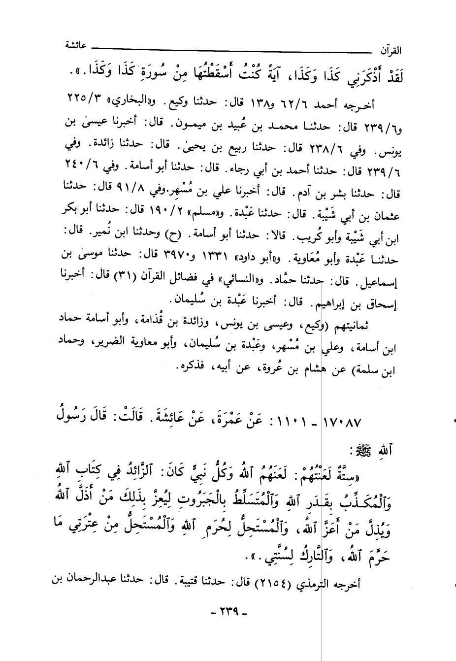 سِتَّةٌ لَعَنْتُهُمْ: لَعَنَهُمُ اللَّهُ وَكُلُّ نَبِيٍّ كَانَ: الزَّائِدُ فِي كِتَاب اللهِ، وَالْمُكَذِّبُ بِقَدَرِ اللهِ، وَالْمُتَسَلِّطُ بِالْجَبَرُوتِ لِيعِزَّ بِذَالِكَ مَنْ اذَلًّ اللَّهُ وُيذِلَّ مَنْ اعَزَّ اللَّهُ، وَالْمُسْتَحِلُّ لِحُرَمِ اللهِ، وَالْمُسْتَحِلُّ مِنْ عِتْرَتِي مَا حَرَّمَ اللَّهُ، وَالتَّارِكُ لِسنَّتِي.