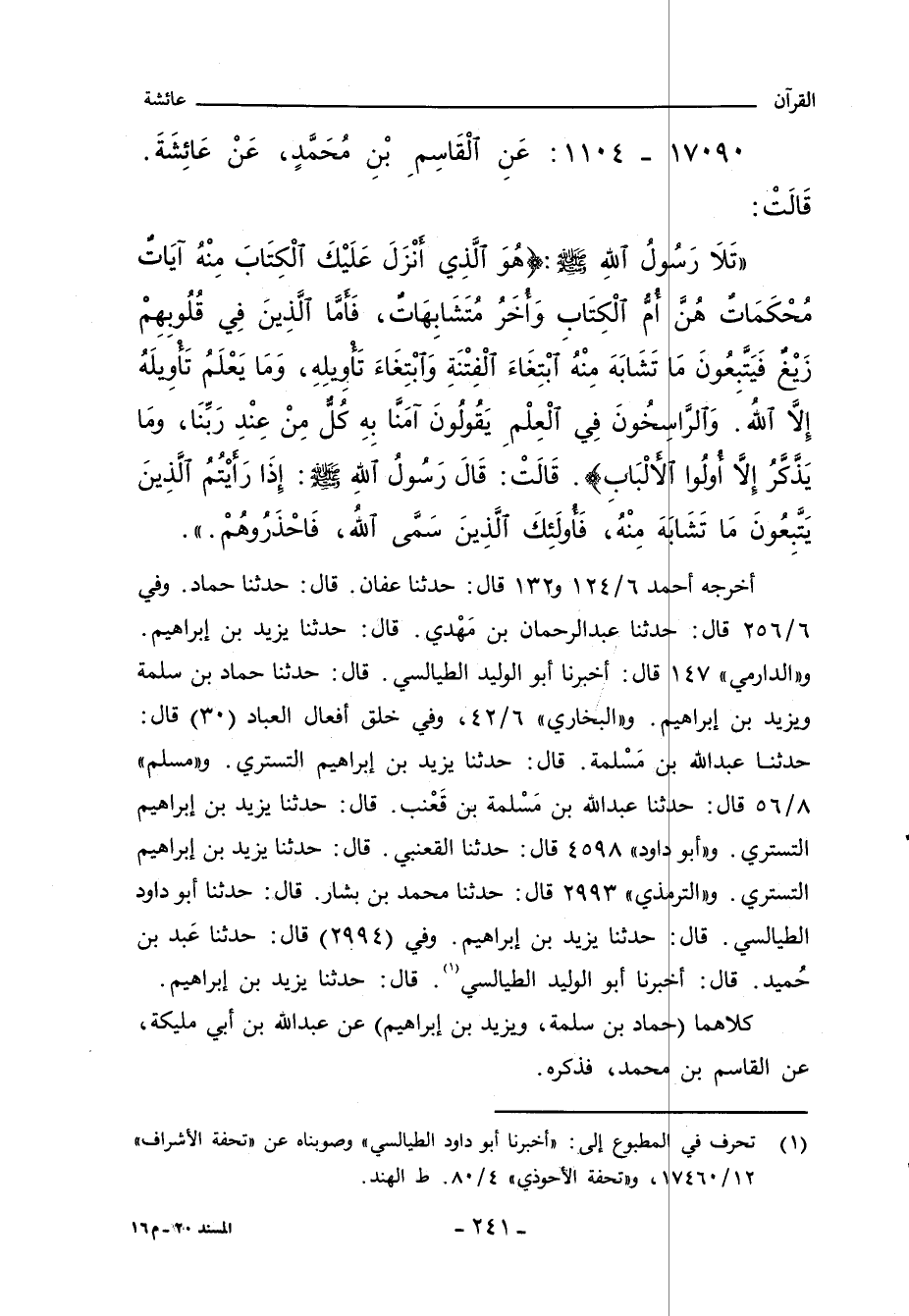 تَلا رَسُولُ اللهِِ صلى الله عليه وسلم: (هُوَ الَّذِي انْزَلَ عَلَيْكَ الْكِتَابَ مِنْهُ ايَاتٌ مُحْكَمَاتٌ هُنَّ أم الْكِتَابِ وَاُخَرُ مُتَشَابِهَاتٌ، فَاُمَّا الَّذِينَ فِي قُلُوبِهِمْ زَيْغٌ فَيَتَّبِعُونَ مَا تَشَابَهَ مِنْهُ ابْتِغَاءَ الْفِتْنَةِ وَابْتِغَاءَ تَاْوِيلِهِ، وَمَا يَعْلَمُ تَاْوِيلَهُ إِلَاّ اللَّهُ. وَالرَّاسِخُونَ فِي الْعِلْمِ يَقُولُونَ امَنَّا بهِ كُلٌّ مِنْ عِنْدِ رَبِّنَا، ومَا يَذَّكَّرُ إِلَاّ اُولُوا الالْبَابِ). قَالَتْ: قَالَ رَسُولُ اللهِِ صلى الله عليه وسلم: إِذَا رَايْتُمُ الَّذِينَ يَتَّبِعُونَ مَا تَشَابَهَ مِنْهُ، فَاُولَئِكَ الَّذِينَ سَمَّى اللَّه، فَاحْذَرُوهُمْ.