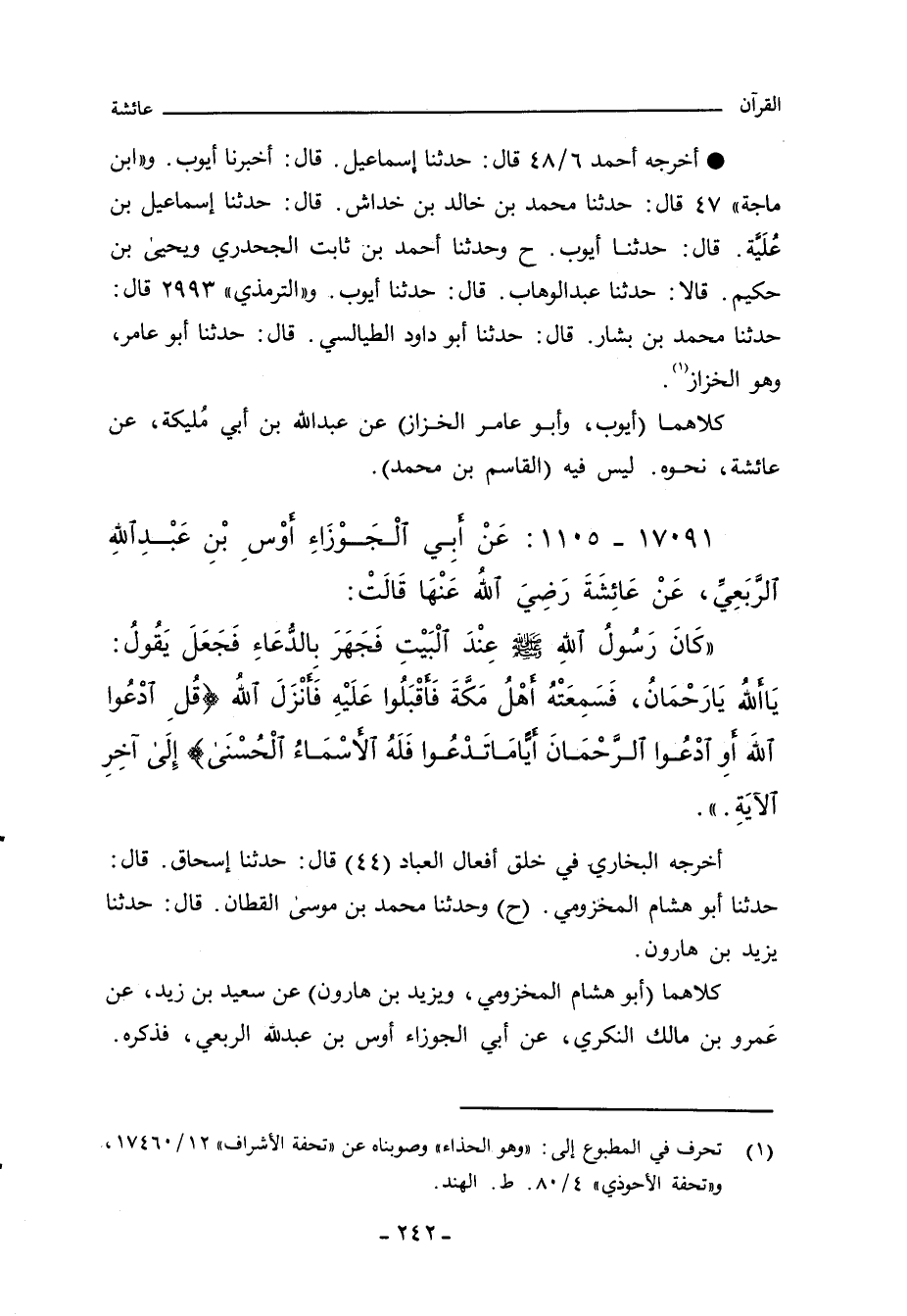 - أخرجه أحمد ٦/ ٤٨ قال: حدثنا إسماعيل. قال: أخبرنا ايوب. و"ابن ماجة" ٤٧ قال: حدثنا محمد بن خالد بن خداش. قال: حدثنا إسماعيل بن علية. قال: حدثنا ايوب. ح وحدثنا أحمد بن ثابَت الجحدري ويحيى بن حكيم. قالا: حدثنا عبد الوهاب. قال: حدثنا ايوب. و"التِّرمِذي" ٢٩٩٣ قال: حدثنا محمد بن بشار. قال: حدثنا ابو داود الطيالسي. قال: حدثنا ابو عامر، وهو الخزاز.