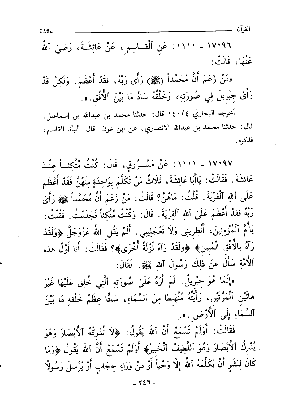 مَنْ زَعَمَ أَنَّ مُحَمَّدًا (صلى الله عليه وسلم) رَاى رَبَّهُ، فقَدْ اعْظَمَ. وَلَكِنْ قَدْ رَاى جِبْرِيلَ فِي صُورَتِهِ، وَخَلْقُهُ سَادٌّ مَا بَيْنَ الافُقِ.