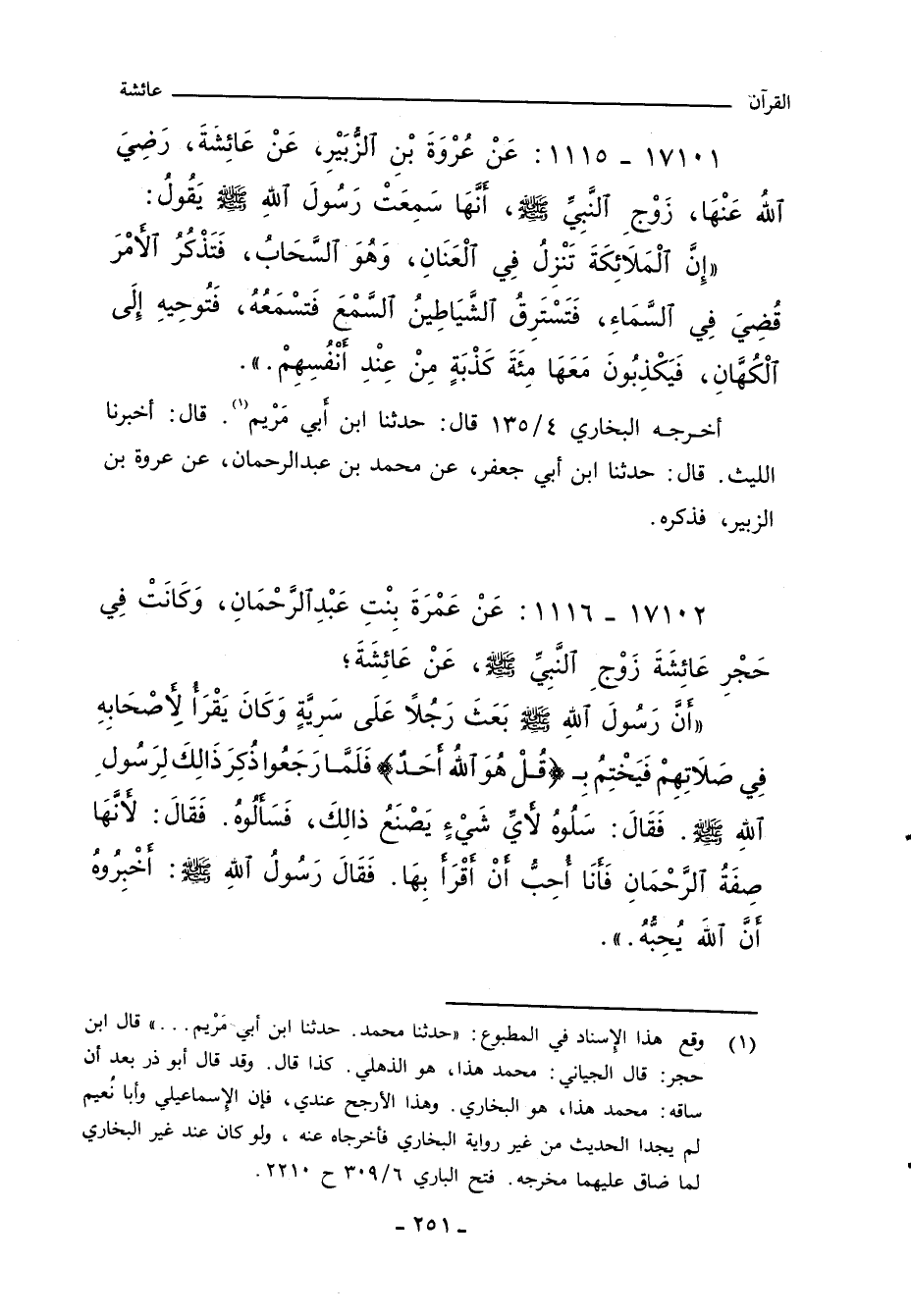 أَنَّ رَسُولَ اللهِِ صلى الله عليه وسلم بَعَثَ رَجُلاً عَلَى سَريَّةٍ وَكَانَ يَقْرَاُ لاصْحَابِهِ فِي صَلاتِهِمْ فَيَخْتِمُ بِـ: (قُلْ هُوَ اللَّهُ احَدٌ) فَلَمَّا رَجَعُوا ذُكِرَ ذَالِكَ لِرَسُولِ اللهِ صلى الله عليه وسلم. فَقَالَ: سَلًوهُ لايِّ شَيْءٍ يَصنَعُ ذالِكَ، فَسَالُوهُ. فَقَالَ: لانَّهَا صِفَةُ الرَّحْمَانِ فَانَا اُحِبُّ أَنْ اقْرَا بِهَا. فَقَالَ رَسُولُ اللهِِ صلى الله عليه وسلم: اخْبِرُوهُ أَنَّ اللَّهُ يُحِبُّهُ.