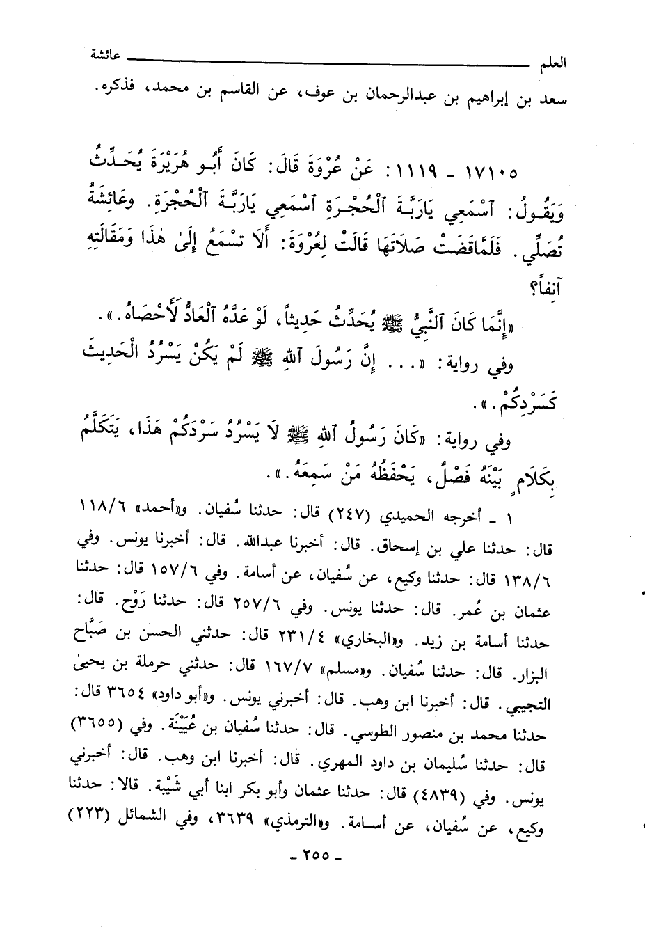 ١ - أخرجه الحميدي (٢٤٧) قال: حدثنا سُفيان. و"أحمد" ٦/ ١١٨ قال: حدثنا علي بن إسحاق. قال: أخبرنا عبد الله. قال: أخبرنا يونس. وفي ٦/ ١٣٨ قال: حدثنا وكيع، عن سُفيان، عن أُسامة. وفي ٦/ ١٥٧ قال: حدثنا عثمان بن عُمر. قال: حدثنا يونس. وفي ٦/ ٢٥٧ قال: حدثنا رَوْح. قال: حدثنا أُسامة بن زيد. و"البُخَارِي" ٤/ ٢٣١ قال: حدثني الحسن بن صَبَّاح البزار. قال: حدثنا سُفيان. و"مسلم" ٧/ ١٦٧ قال: حدثني حرملة بن يحيى التجيبي. قال: أخبرنا ابن وهب. قال: أخبرني يونس. و"أبو داود" ٣٦٥٤ قال: حدثنا محمد بن منصور الطوسي. قال: حدثنا سُفيان بن عُيَيْنَة. وفي (٣٦٥٥) قال: حدثنا سُليمان بن داود المهري. قال: أخبرنا ابن وهب. قال: أخبرني يونس. وفي (٤٨٣٩) قال: حدثنا عثمان وأبو بكر بن أبي شَيْبة. قالا: حدثنا وكيع، عن سُفيان، عن أُسامة. و"التِّرمِذي" ٣٦٣٩، وفي الشمائل (٢٢٣)
